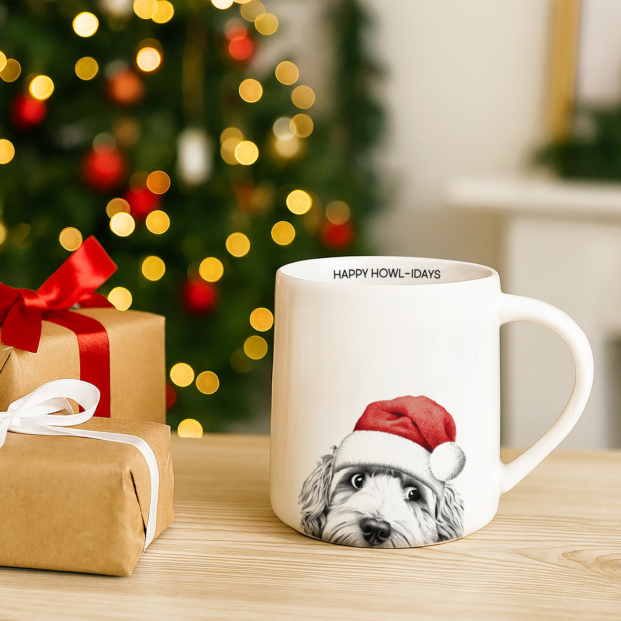 - IN-HOUSE DESIGN: A fluffy dog in a floppy red Santa hat beams joy across the front, while “Happy Howl-idays” is printed along the inner rim. The hand-drawn look, textured shading, and rich red accent colors give it a warm, rustic aesthetic.