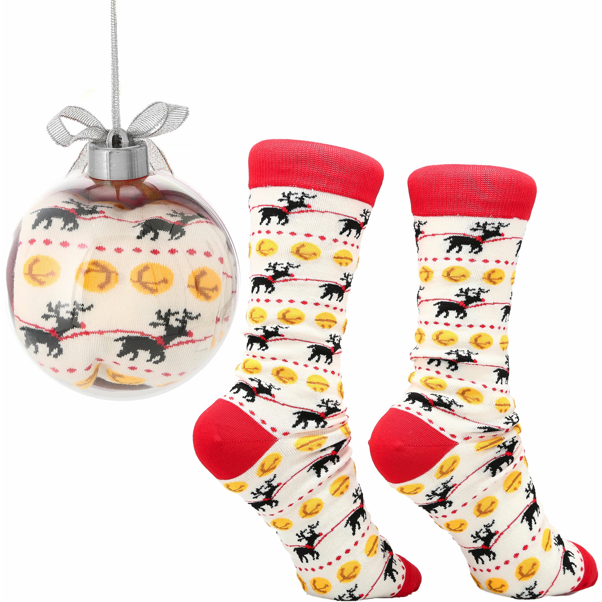 • PREMIUM QUALITY: Our 4" plastic ornament is the perfect addition to your holiday decorations. With its organza silver ribbon, clear backing, silver cap, and red sparkle front, it adds a touch of elegance and festive cheer to any Christmas tree. Hang it with pride and let it sparkle and shine as a symbol of holiday joy. The socks, made from a comfortable blend of 70% cotton, 28% polyester, and 2% spandex, are rolled inside the ornament. These unisex socks are available in M/L size, fitting women US 9-13 and men US 8-12.