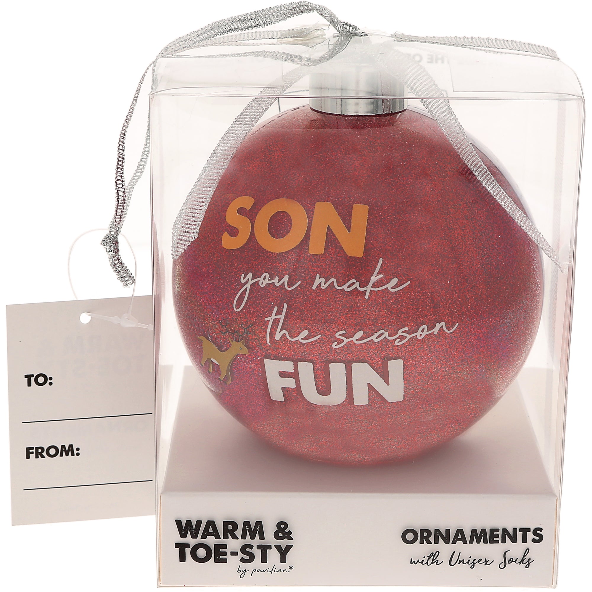 • IN-HOUSE DESIGN: Our crew socks are the perfect addition to your seasonal wardrobe. Featuring a red heel, toe, and ankle, along with a cream background, these socks stand out with their vibrant colors. The overall reindeer, sleigh bell, and polka-dotted pattern add a festive touch to your outfit. Our 4" plastic ornament is a must-have for holiday enthusiasts. The decoration has a reindeer and a "Son You Make The Season Fun" sentiment.