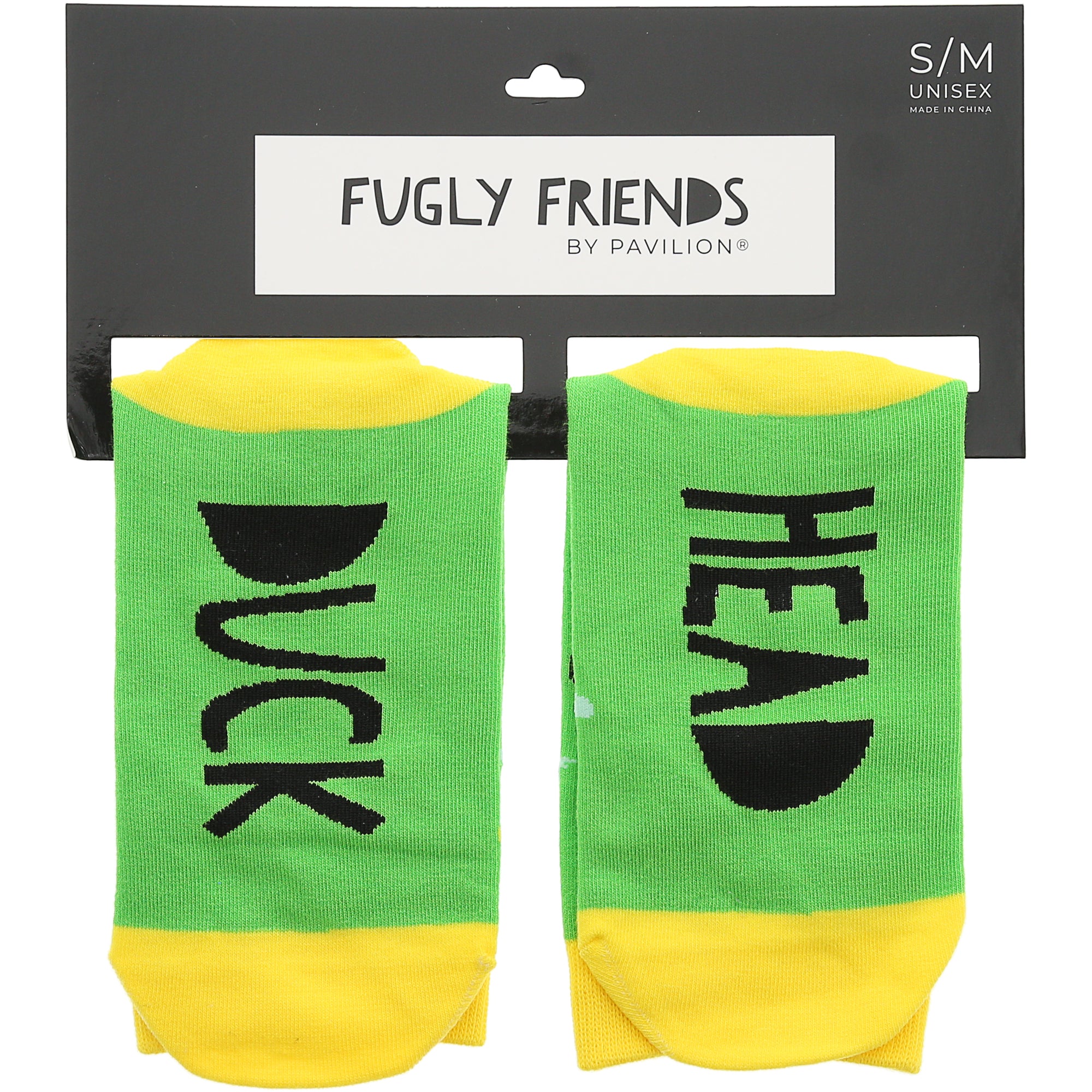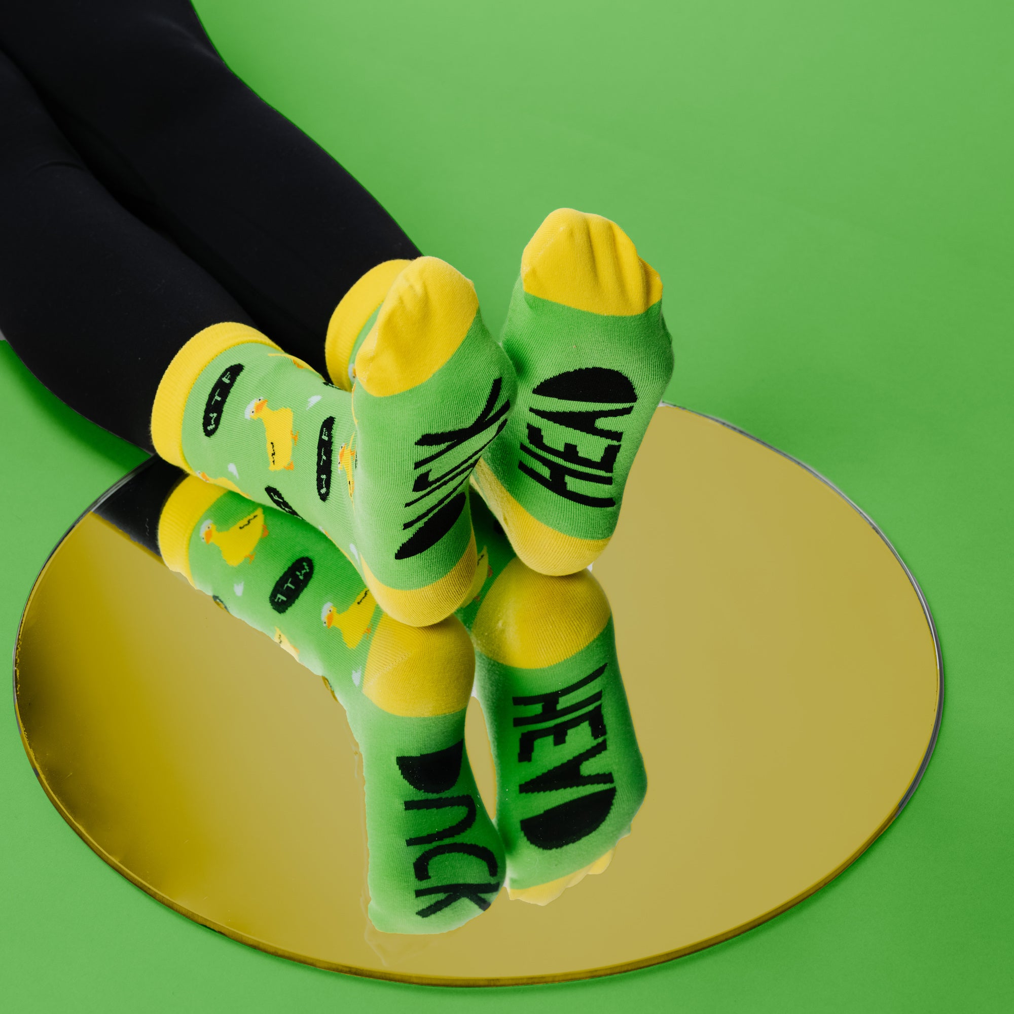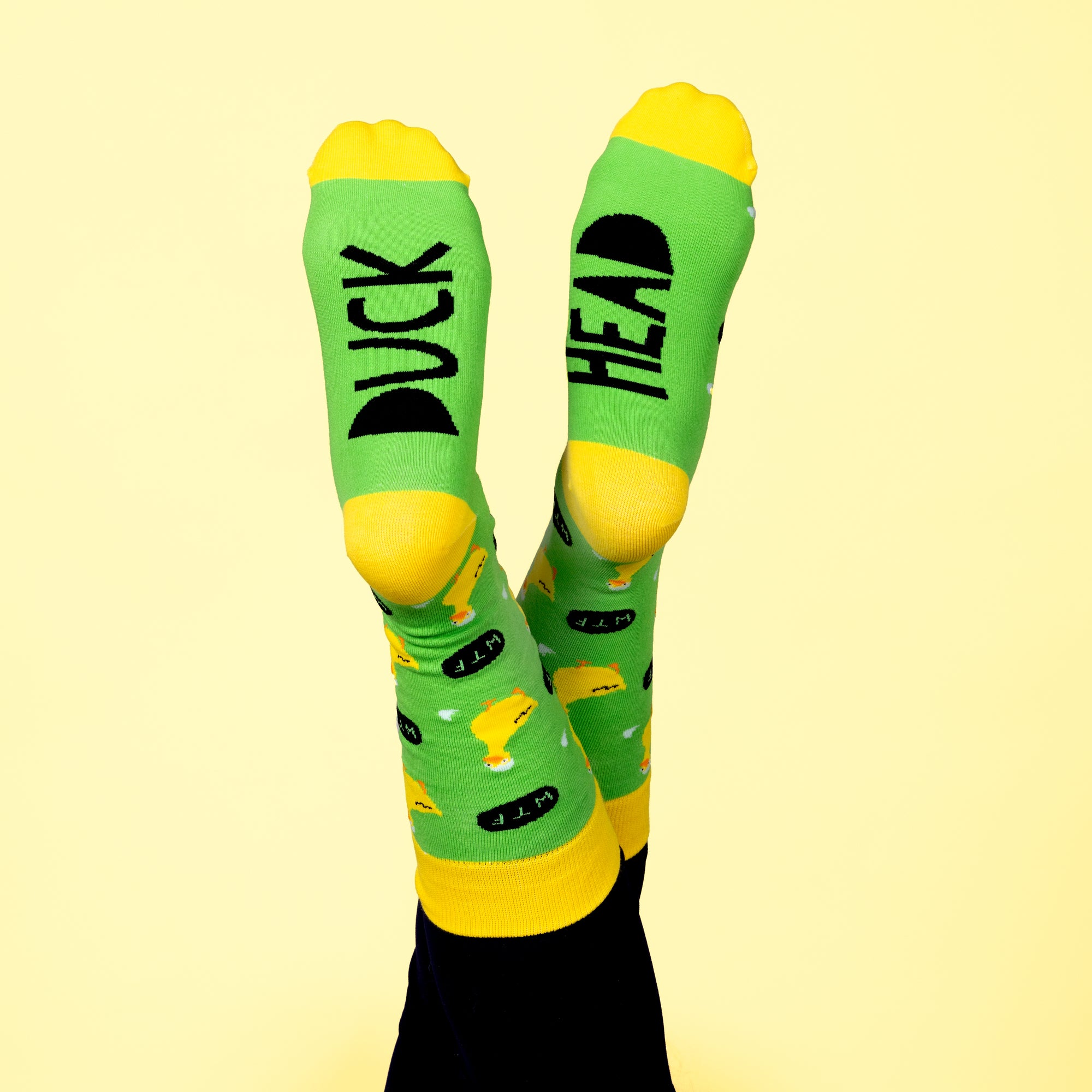 - IN-HOUSE DESIGN: Yellow ankle, heel, and toes are attached to an overall green body. The duck characters wear a light blue eggshell on their heads—repetitive black speech bubbles with "WTF" in green font. One sock bottom has "DUCK" sentiment while the opposite sock has "HEAD" sentiment in black.