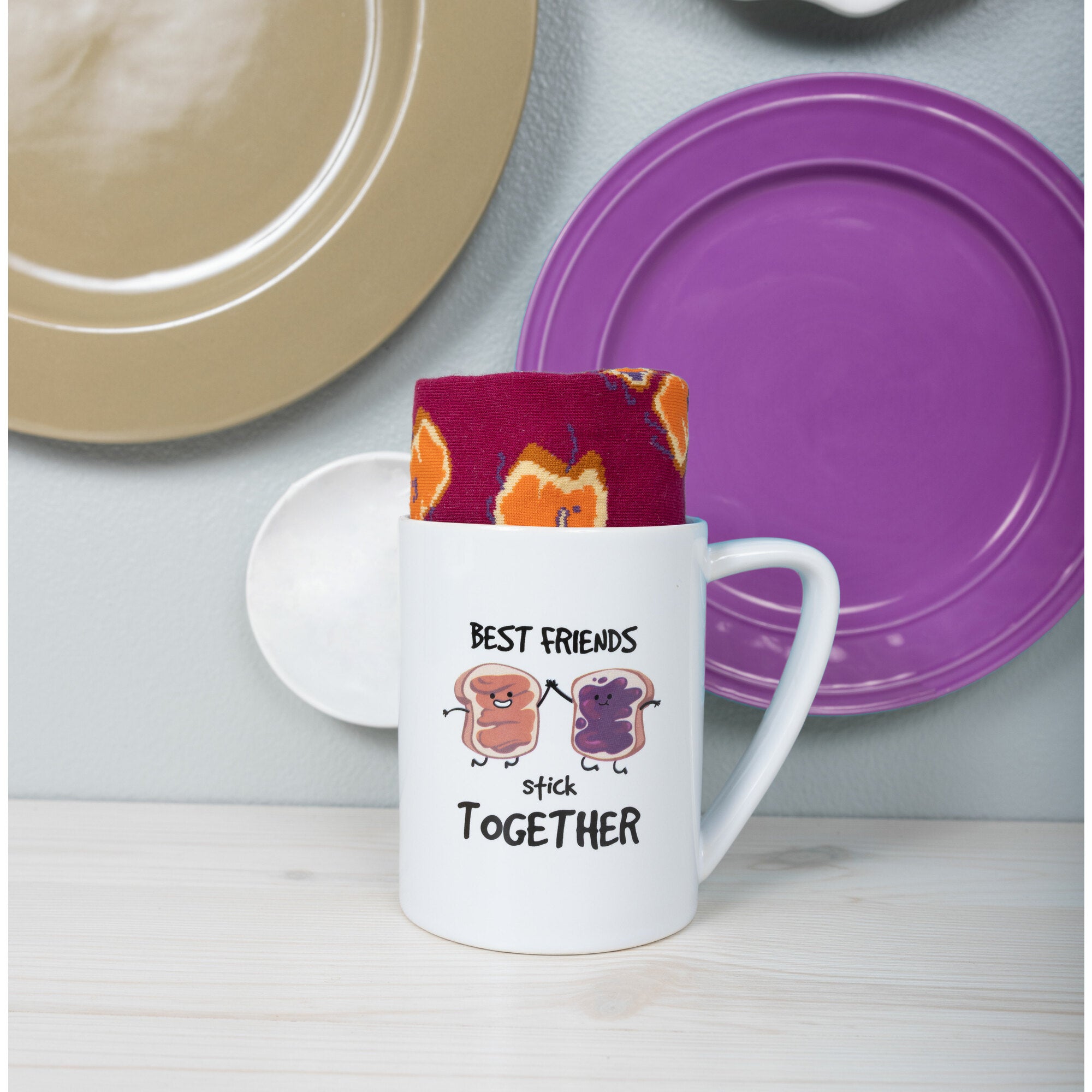 - IN-HOUSE DESIGN: "Best Friends Stick Together" text and bread with peanut butter and bread with grape jelly character designs are printed onto the front of the mug. The purple socks have an orange toe, ankle, and heel with a repetitive PB & J pattern.