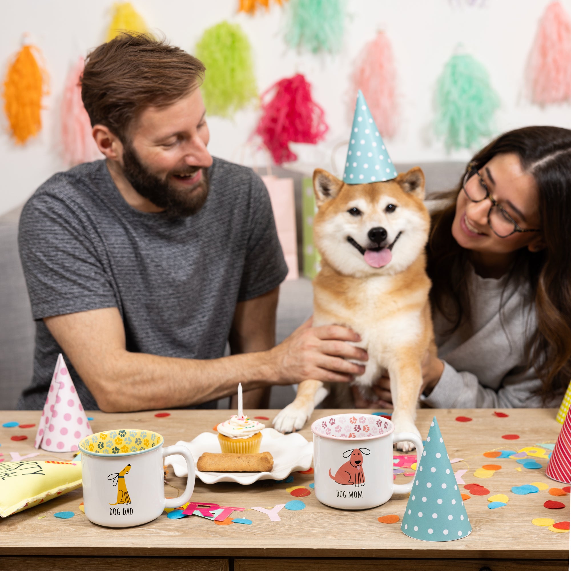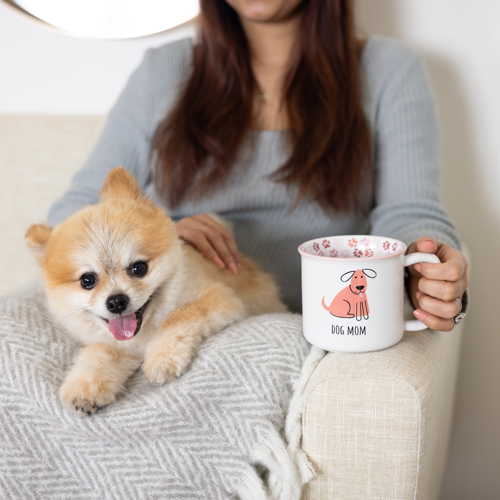 • IN-HOUSE DESIGN: The mug's front features a sitting pink character dog with the sentiment: "Dog Mom." The lip of the mug is pink; the interior is white with pink and purple pawprints throughout.