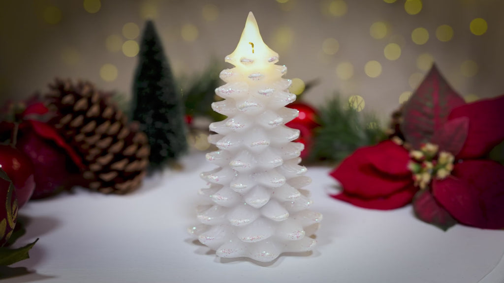- IN-HOUSE DESIGN: The white wax pine tree has frosted white snow tips and an added sparkling glitter touch. The waving flame imitates a real candle without the risks of open fire that can be hazardous to densely decorated areas.