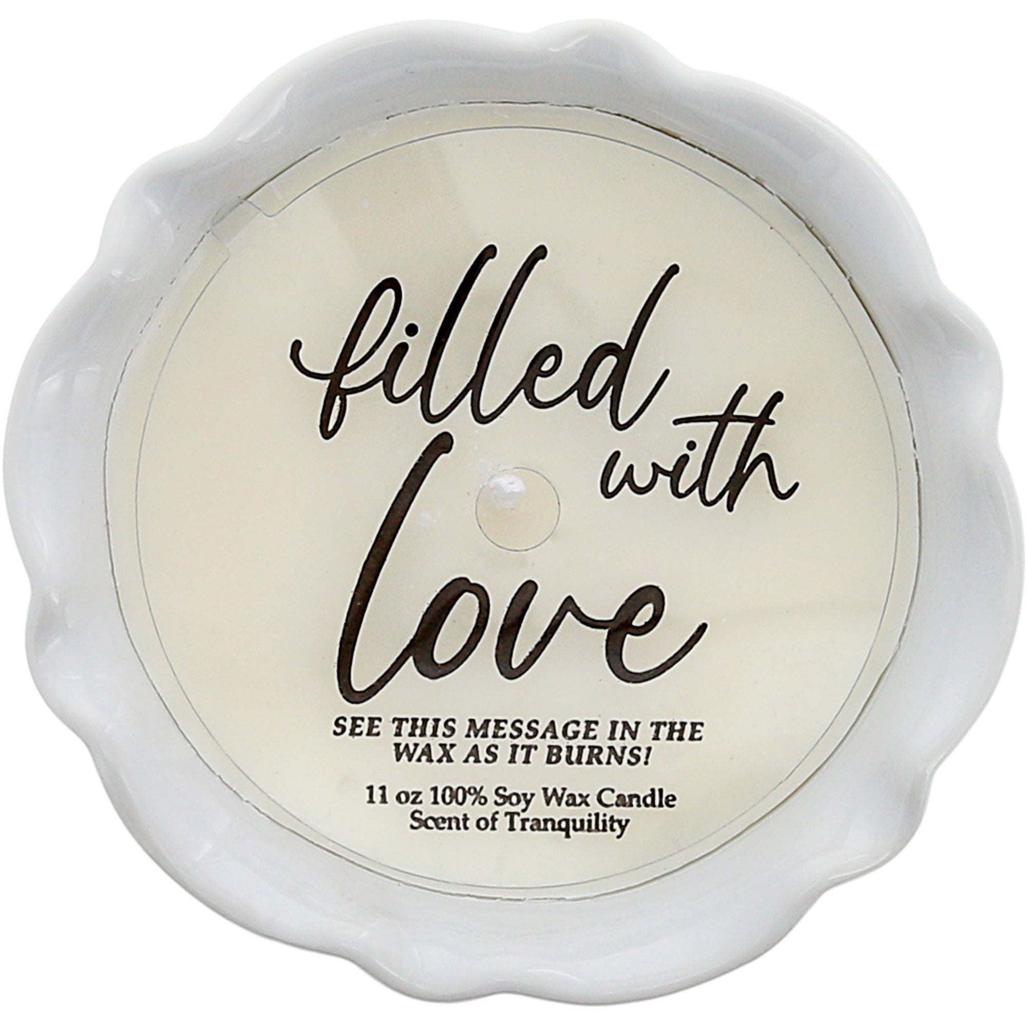 - IN-HOUSE DESIGN: The new & innovative candle offers a unique message for your loved one within the wax as time progresses. You will see cursive written "Filled With Love" sentiment after about 10 minutes. As you watch, the entire decal will appear after 60 minutes. Then, the message will hide again and reappear with each burn. The front of the candles has a simplistic "Love Lives Here" decal accompanied by an ombre white & tan pattern.