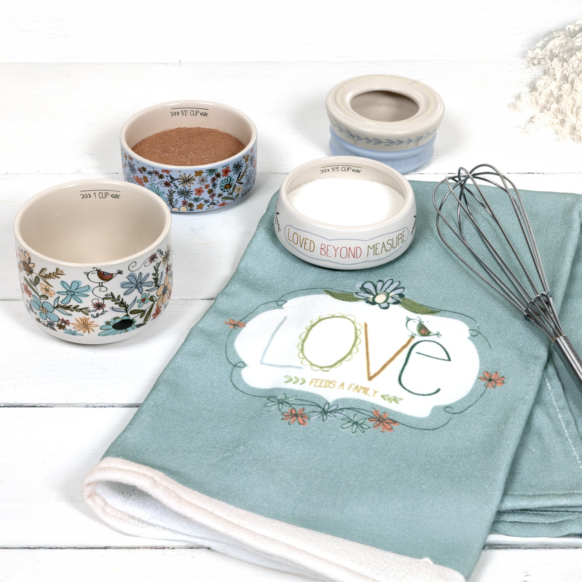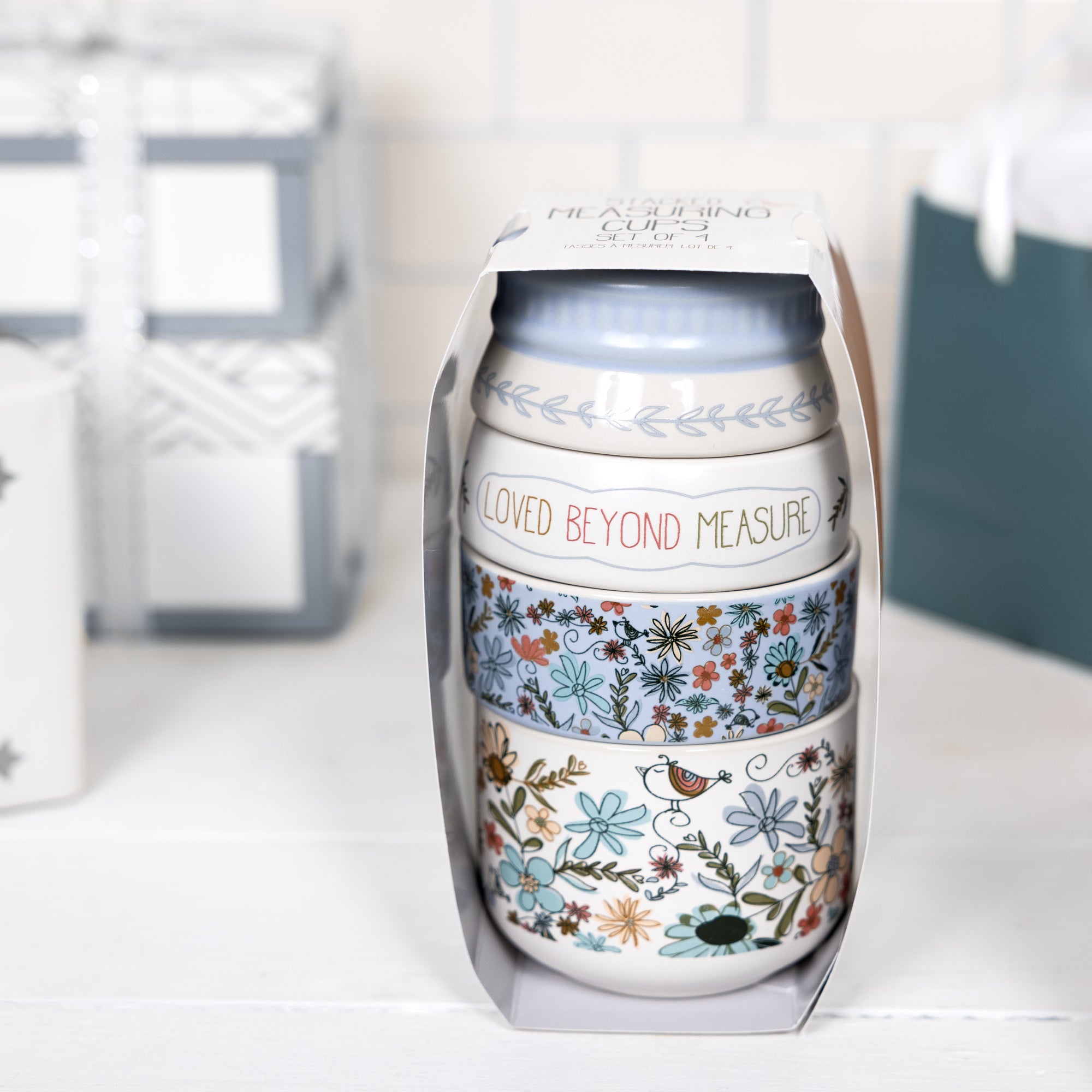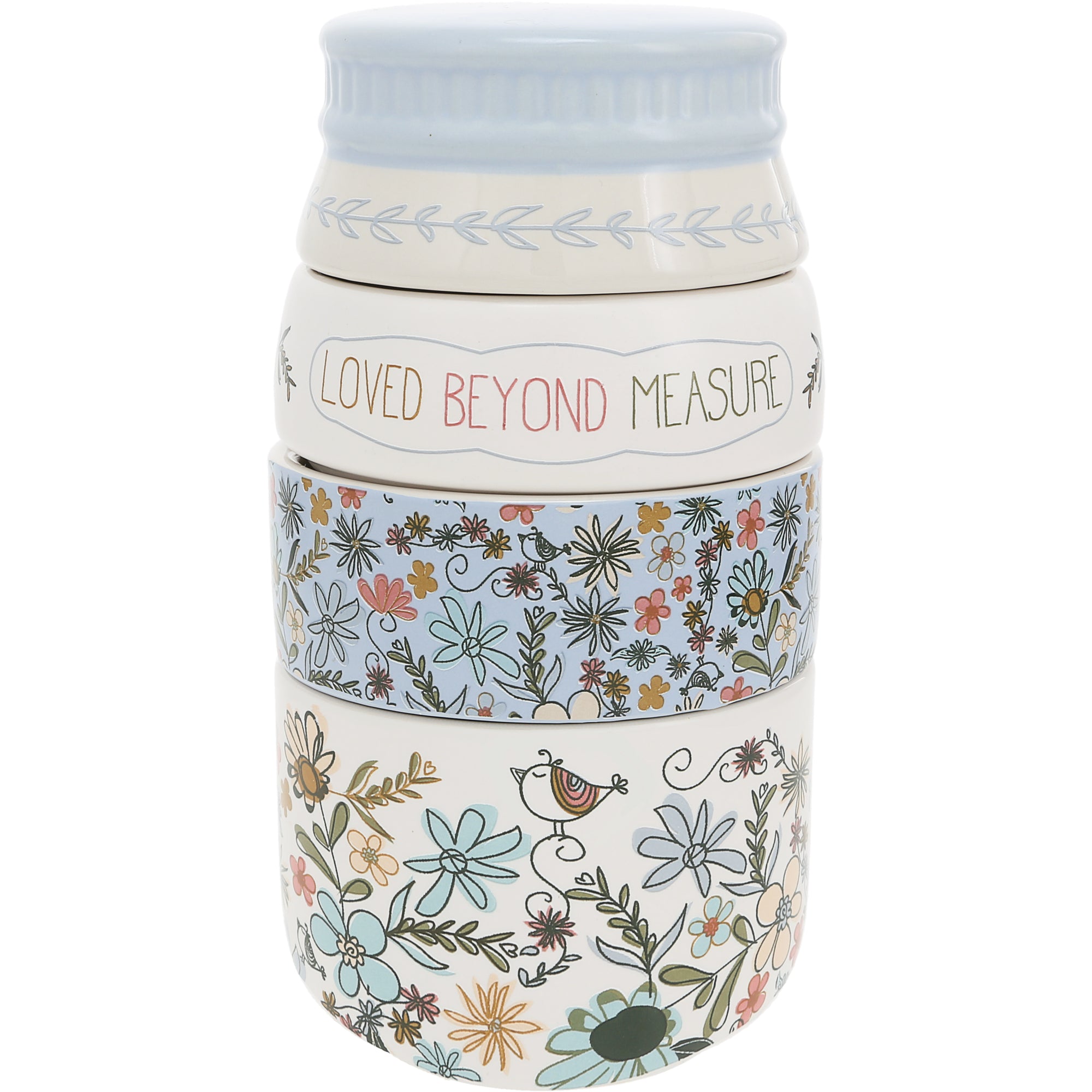- IN-HOUSE DESIGN: This 6.75” x 3.5” ceramic measuring cup set is more than just a kitchen essential—it's a decorative statement piece that adds charm and warmth to your home. The exterior showcases a floral design with delicate birds and botanical elements, while the engraved sentiment "Loved Beyond Measure" serves as a meaningful reminder of appreciation and love. The cups nest together to form the shape of a mason jar, creating a unique and space-saving design.