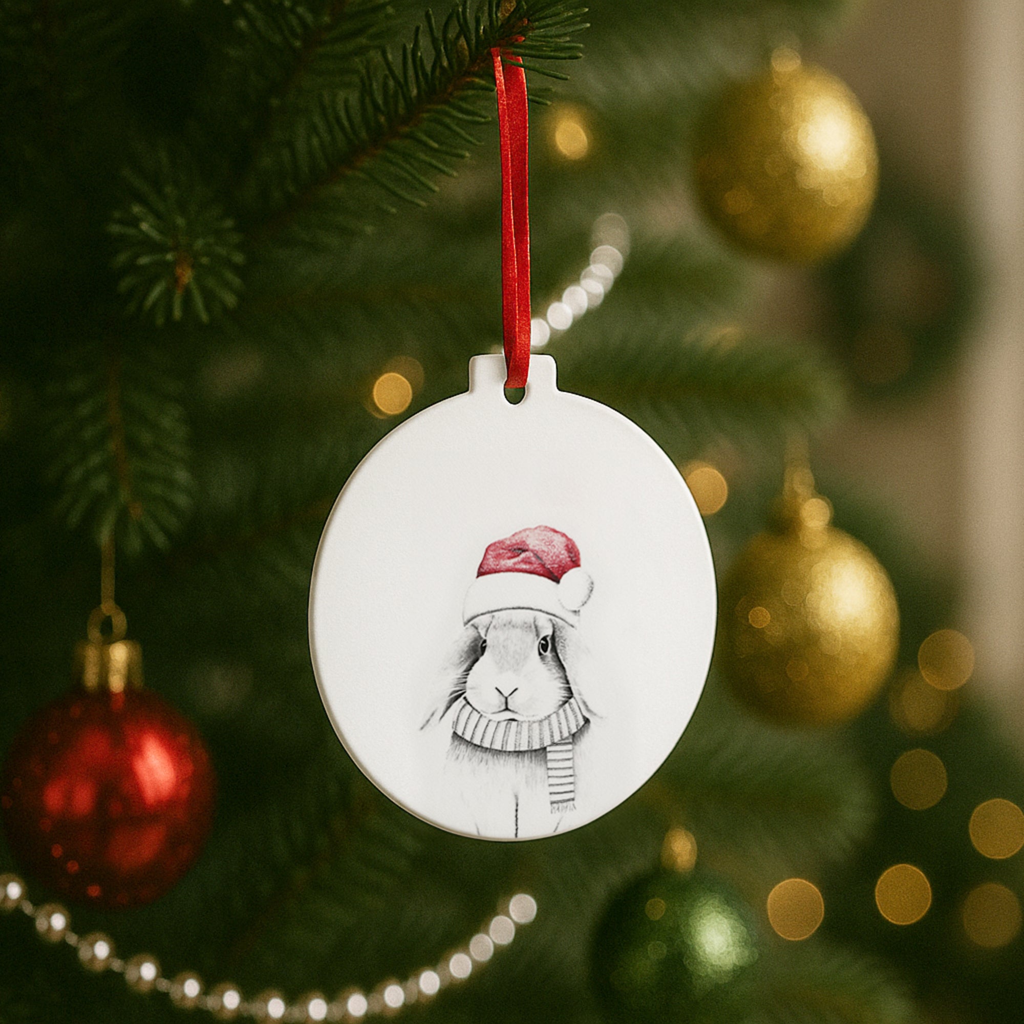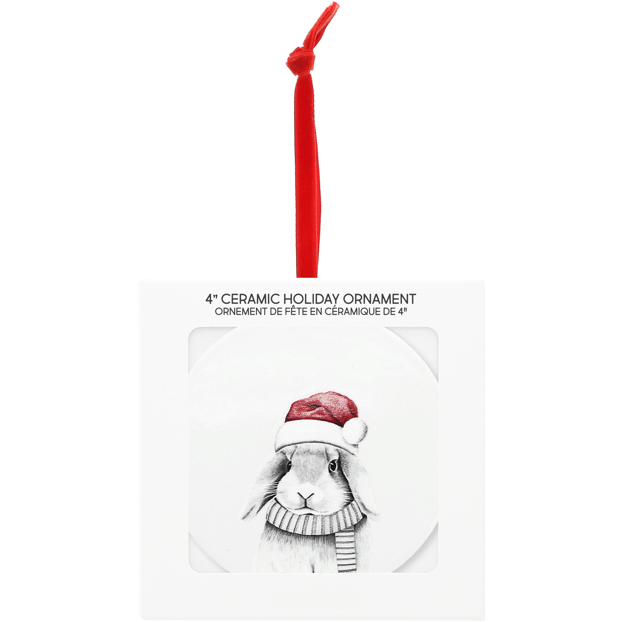 - PREMIUM QUALITY: This 3.5" x 4" ceramic tile ornament features a gentle bunny in a cozy red Santa hat and soft scarf. Printed in crisp 3D artwork on both front and back, with a luxurious red velvet ribbon that makes it ideal for hanging on trees, garlands, or gifts.