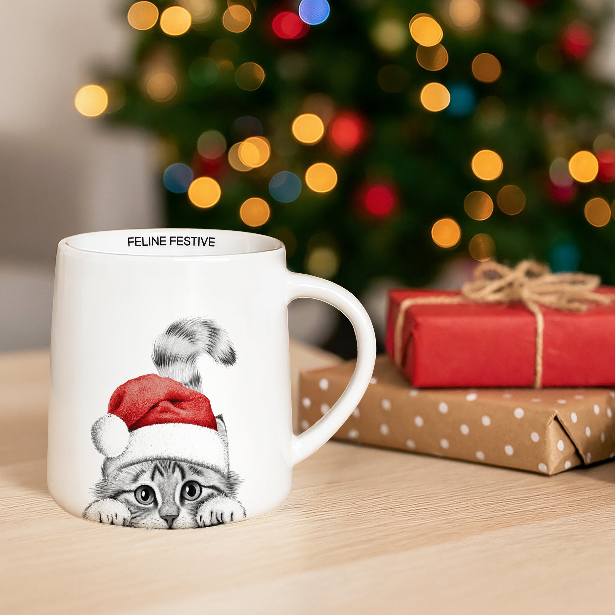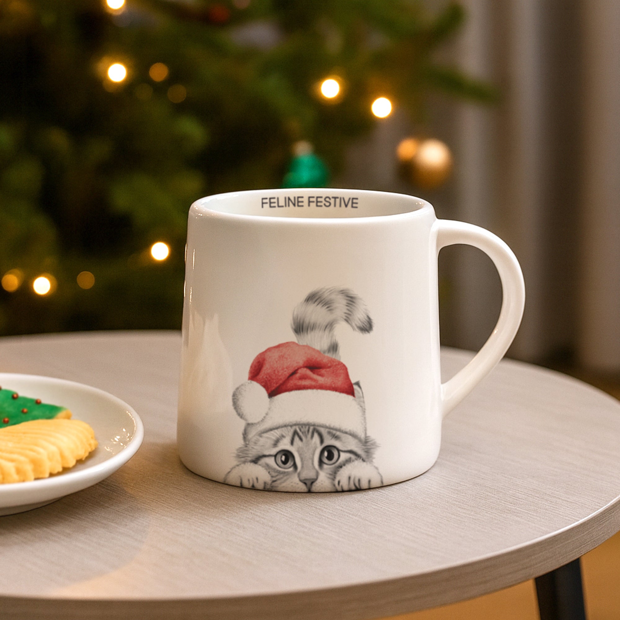 • IN-HOUSE DESIGN: Features an adorably wide-eyed cat in a Santa hat with a fluffy pom-pom and a mischievous expression. The rim text reads: “Feline Festive” in coordinating font. The illustration is detailed with soft pencil textures and red accents for a classic holiday pop.