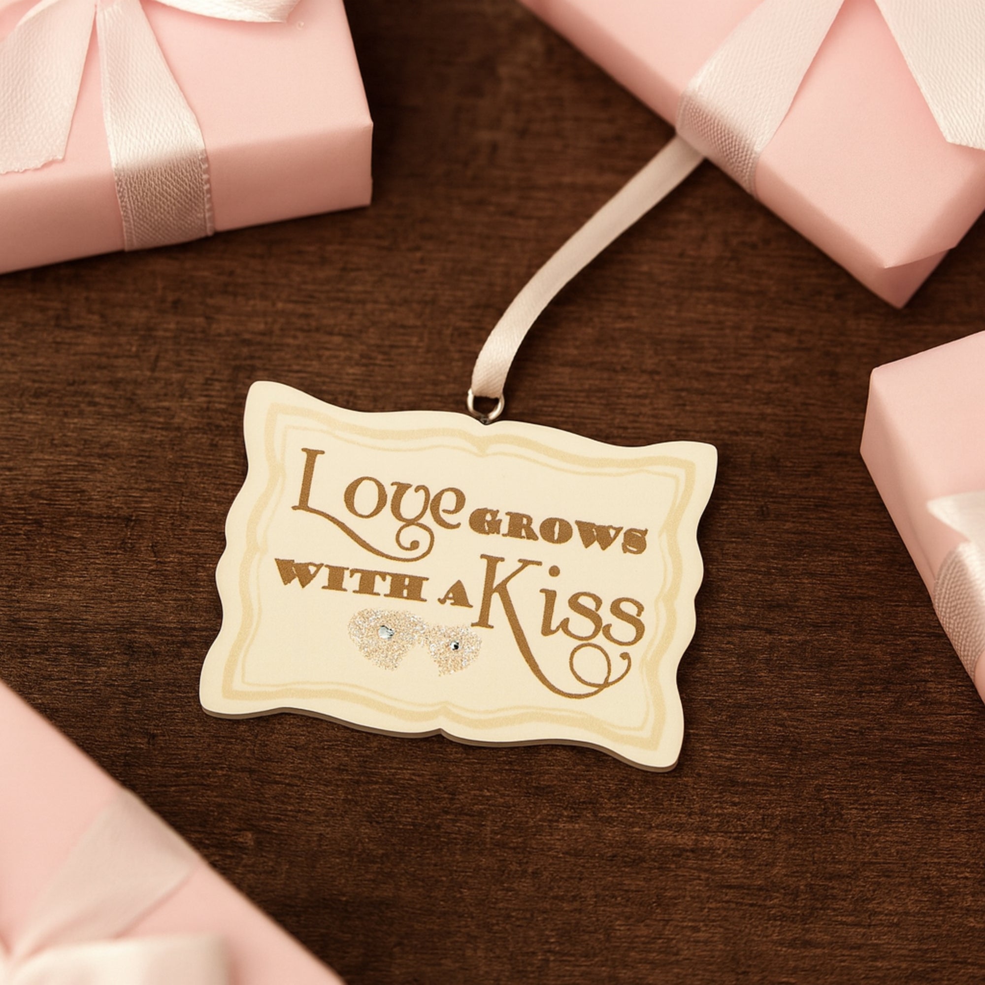 - IN-HOUSE DESIGN: "Love Grows With A Kiss" text and accompanying heart design are both printed onto the front of the plaque.
