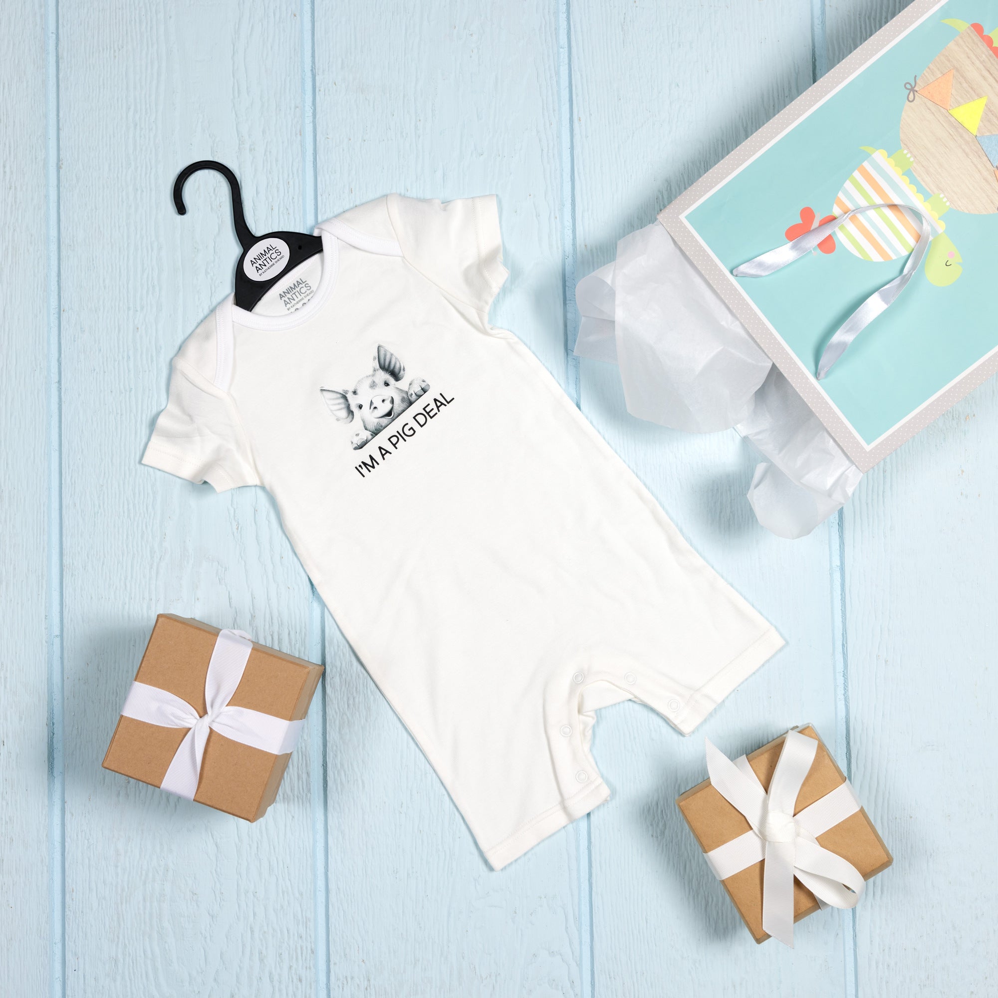 • IN-HOUSE DESIGN: This romper is adorned with an endearing pig illustration and the phrase “I’m a Pig Deal” on the front, capturing the playful spirit of childhood. The back is finished with “OINK! OINK!” text, adding an extra layer of fun to the outfit. Designed by artist Katherine Sheard, this romper reflects the unique charm of the Animal Antics collection, celebrating the quirky, lovable personalities of animals in a way that appeals to both babies and adults.