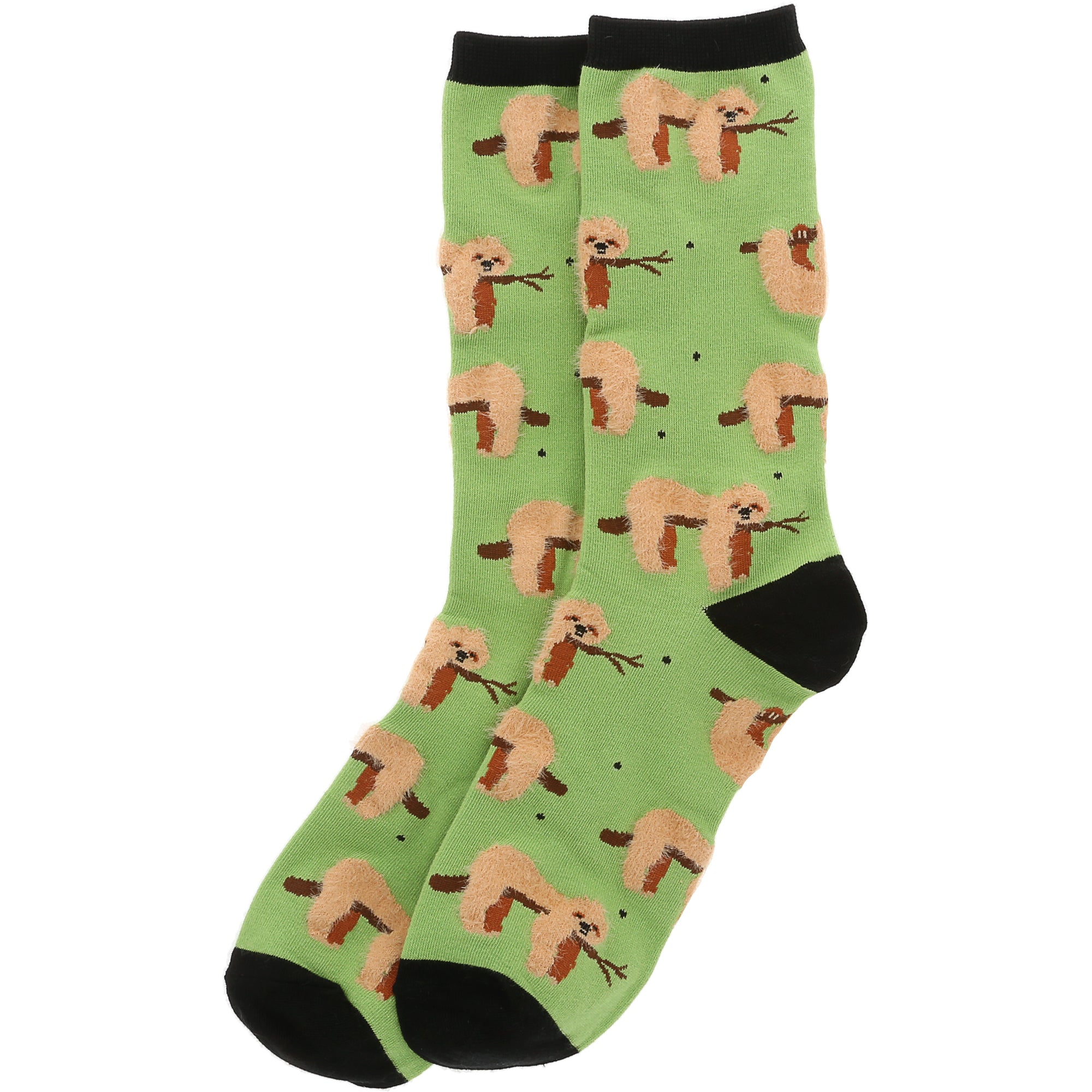 • IN-HOUSE DESIGN: Set against a soft lime green background, these socks feature an endearing lineup of sloths hanging from branches, some smiling, others just chilling. The cozy black heel and cuff add contrast, grounding the design while giving it a modern, clean finish that enhances the vibrant sloth print.