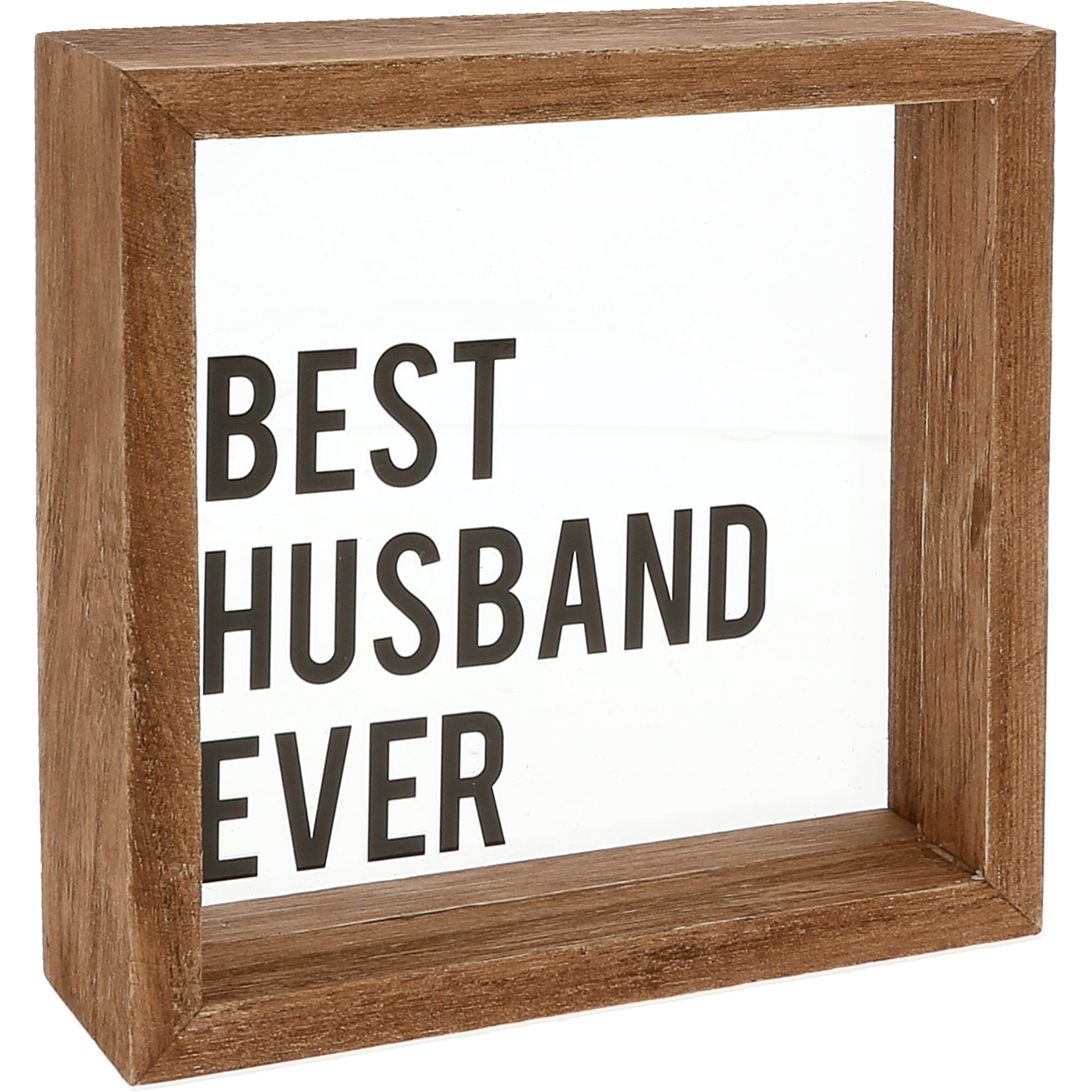 - PREMIUM QUALITY: This 5" x 5" plaque is constructed with a dark wood-stained frame and a clear glass front displaying the sentiment “Best Husband Ever.” Comes with a metal sawtooth hanger for wall mounting or can stand freely.