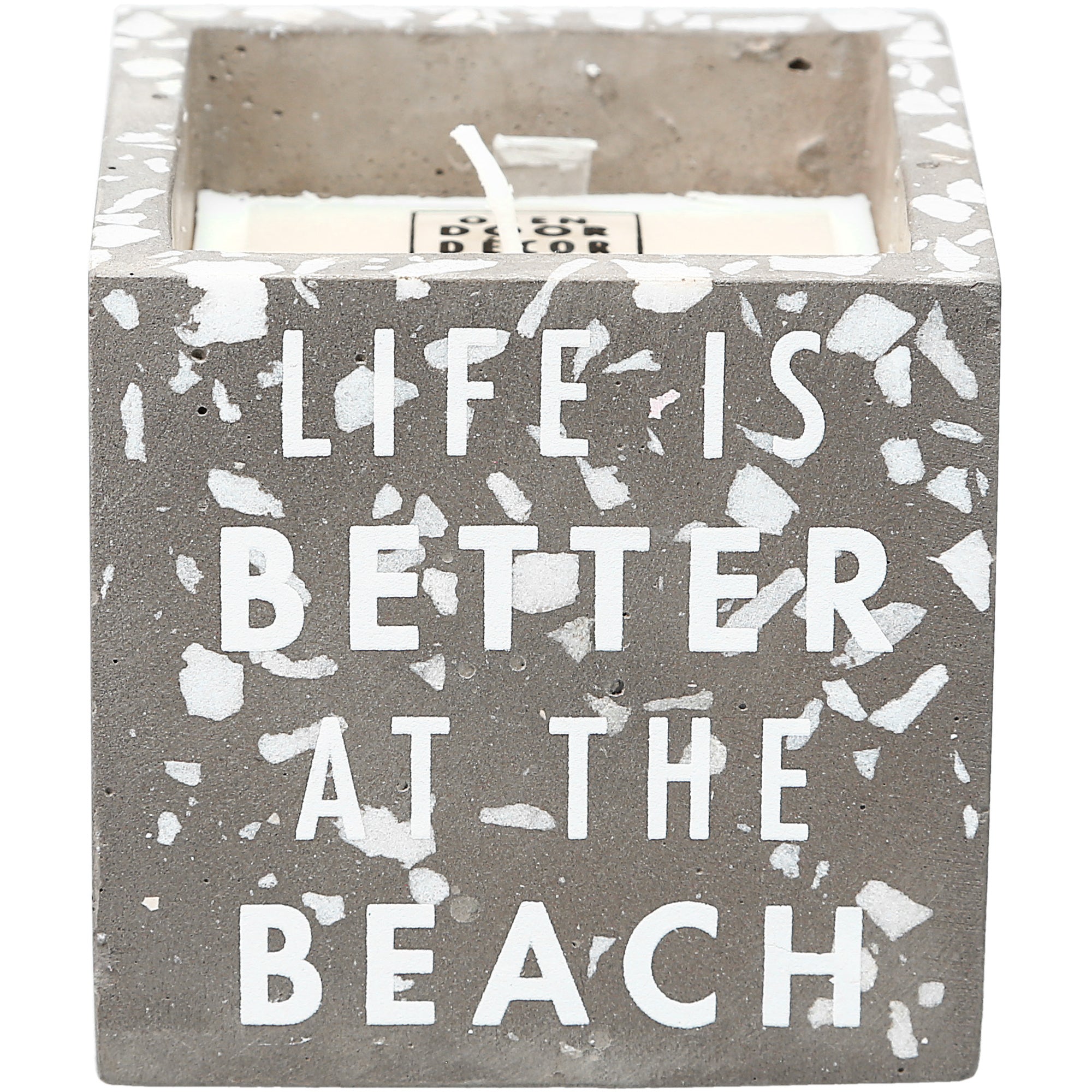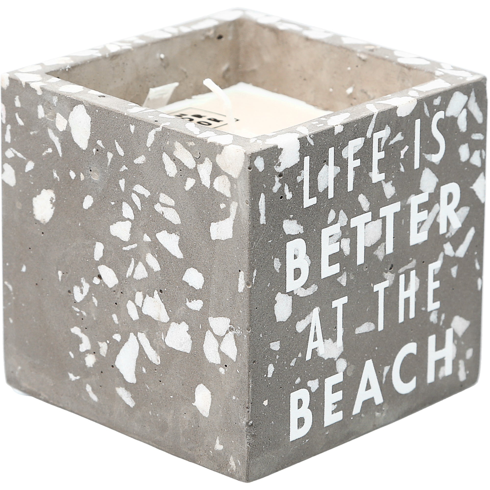 • IN-HOUSE DESIGN: Gray square candle with a white speckled pattern is accompanied by "Life Is Better At The Beach" glossy white sentiment on the front side. The artwork was created with simplistic neutral tones to fit into any home.
