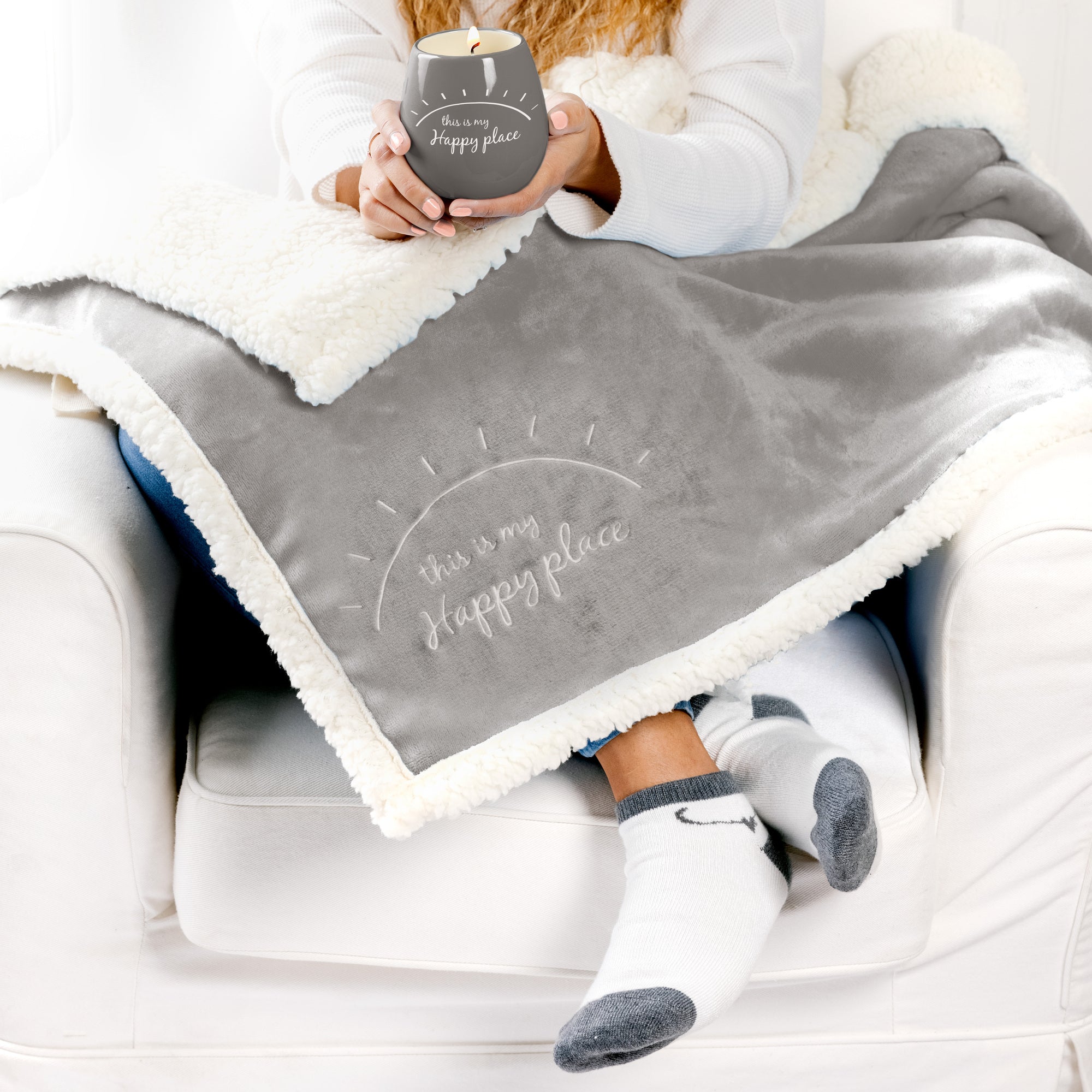 - IN-HOUSE DESIGN: The double-sided blanket has a debossed white embroidered "this is my happy place" sentiment matched by a burst of sunshine pattern on the gray plush side of the blanket. The aromatherapeutic candle has a white "this is my happy place" sentiment and sun design. Socks have a gray ankle, heel, and toe accompanied by a heart and swirl design on a white sock base.