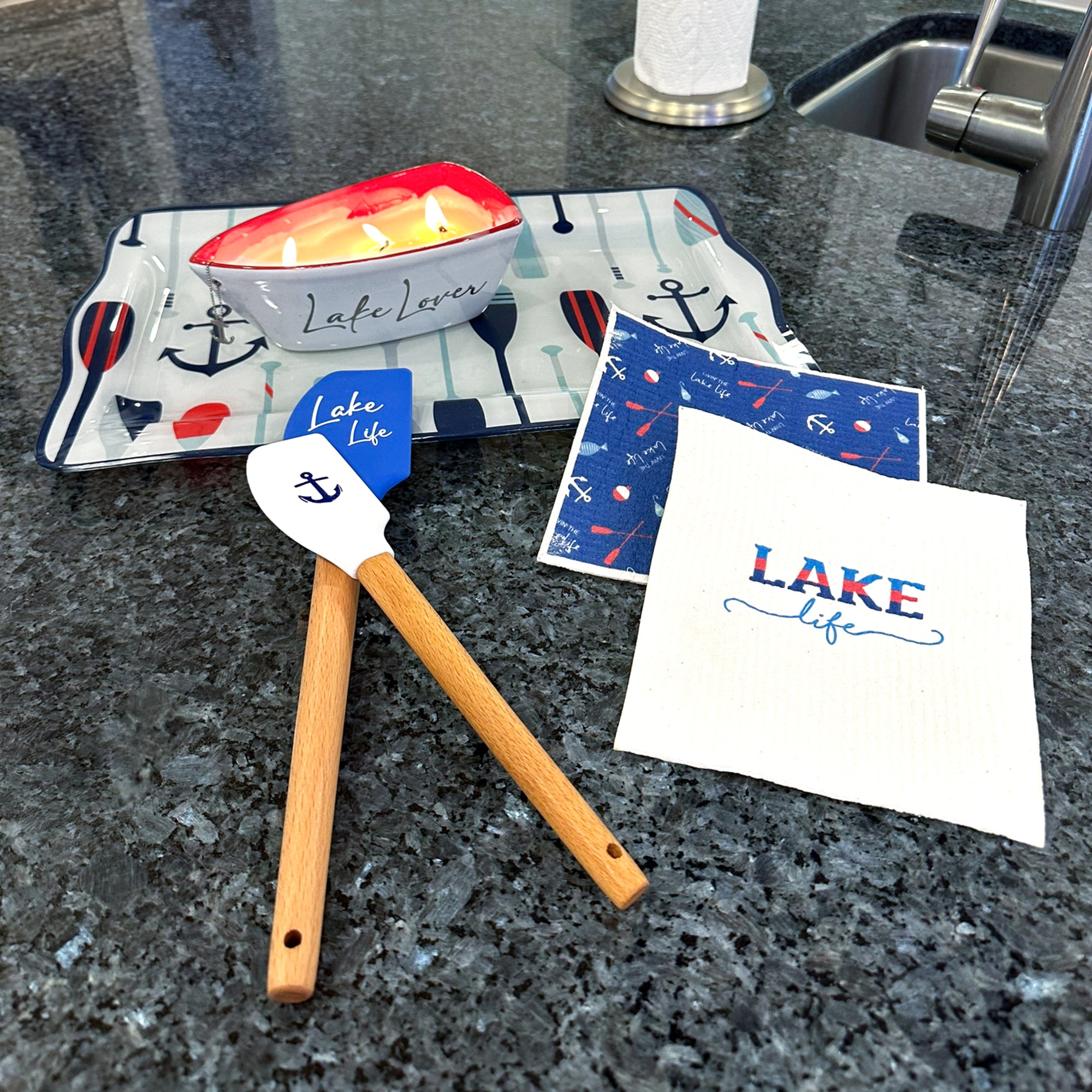 - IN-HOUSE DESIGN: Each item in this lake-themed kitchen set features unique lake-inspired artwork, designed to bring a sense of tranquility and adventure into your home. The spatulas and dish cloths highlight lake life sentiments, from fishing hooks and boat oars to anchors, reflecting the relaxed atmosphere of lakeside living. This set blends functionality with lakefront style, enhancing your kitchen’s aesthetic with a touch of waterfront charm.