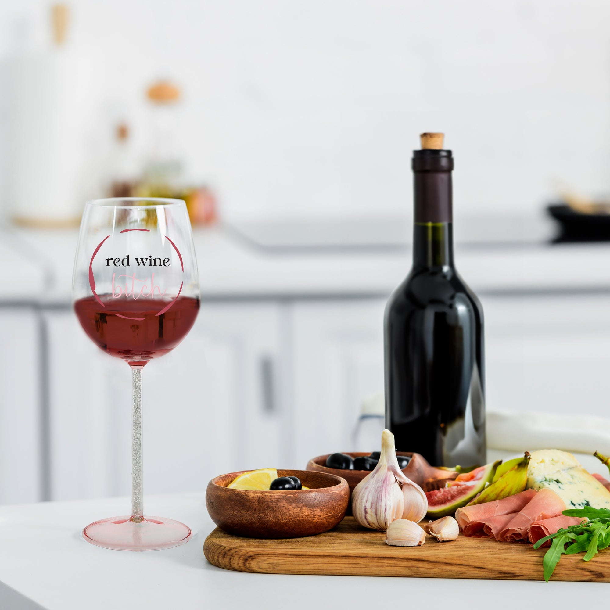 • IN-HOUSE DESIGN: This cheeky wine glass features the playful phrase "Red wine bitch" in a elegant font, adding a fun and sassy twist to any wine lover's collection. The elegant pink spray-accented stem, filled with crystal gems, elevates the design with a touch of sophistication. The contrast between the humorous text and the refined crystal-filled stem creates a unique, stylish piece that stands out, making it perfect for casual wine nights or as a playful gift for a fellow wine enthusiast.