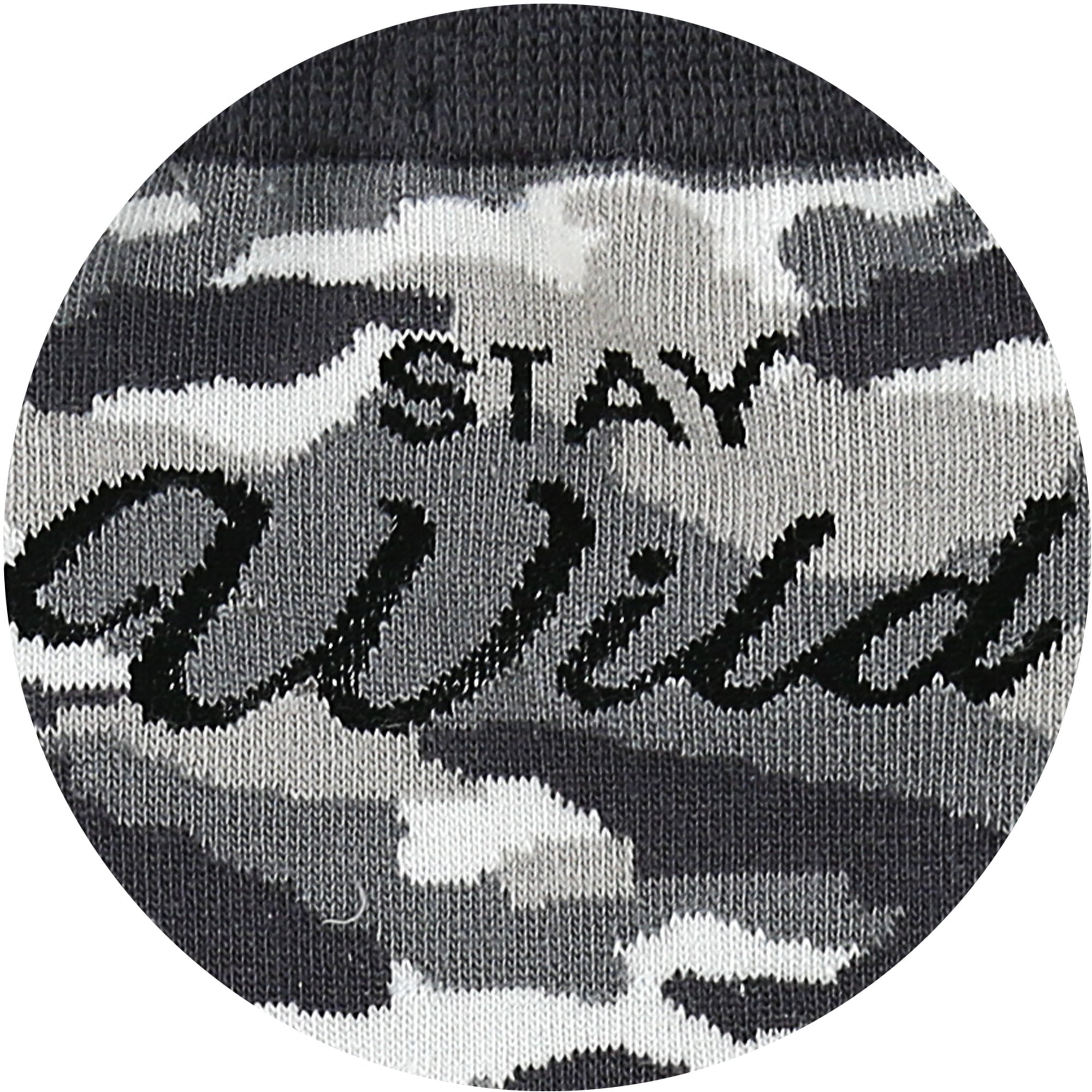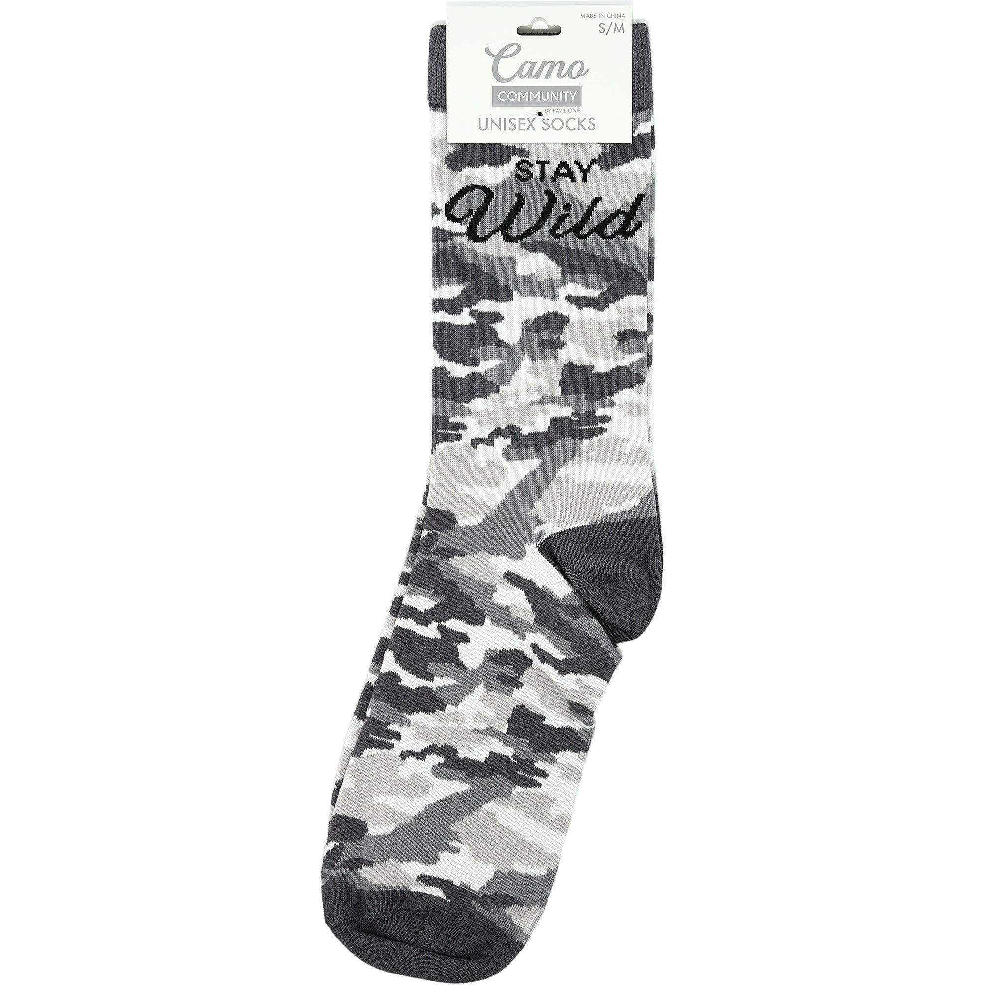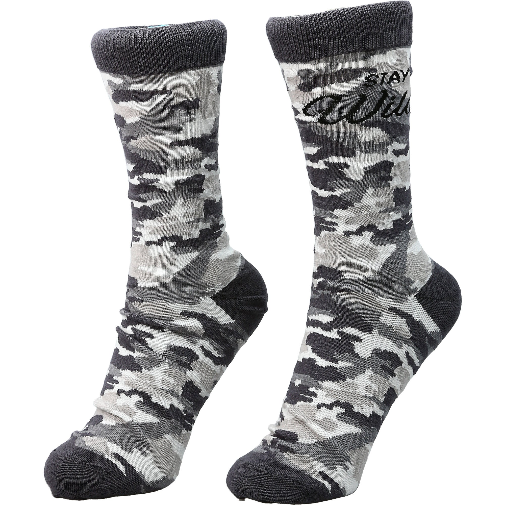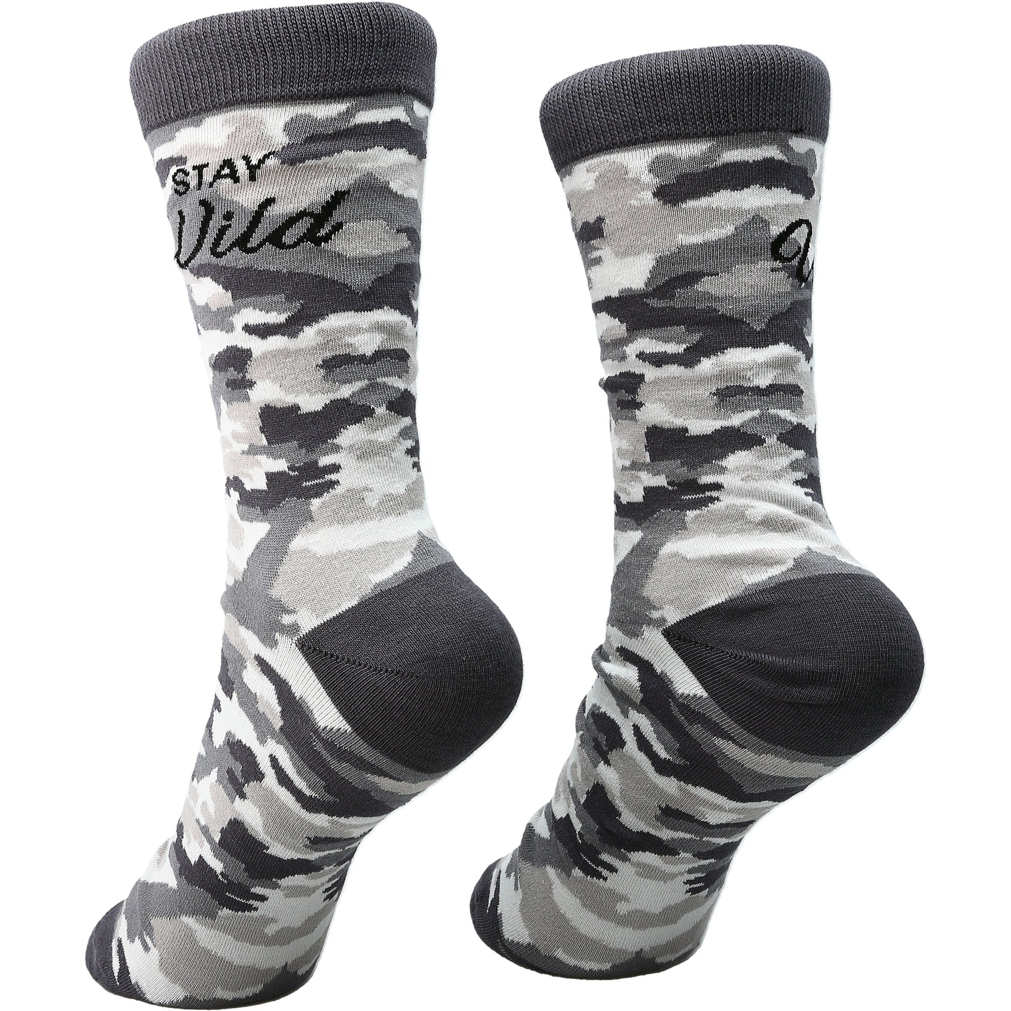 - IN-HOUSE DESIGN: "Stay Wild" text is sewn into the side of the socks with a gray camo pattern that covers all but the heel, ankle and toe which are solid.