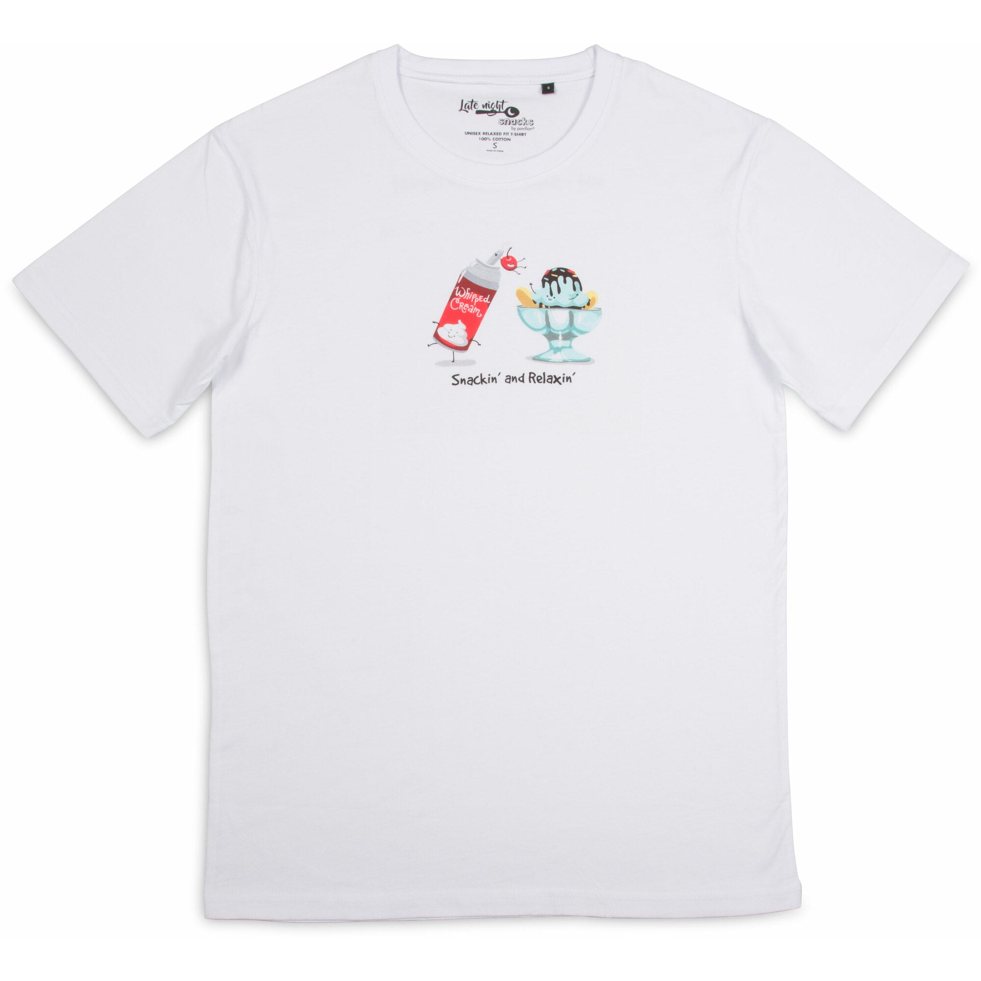 • IN-HOUSE DESIGN: "Snackin' And Relaxin'" text is printed on the front of the t-shirt, alongside the printed ice-cream and whipped cream icons. "Eat. Sleep. Snack. Repeat." text is printed on the back of the t-shirt.