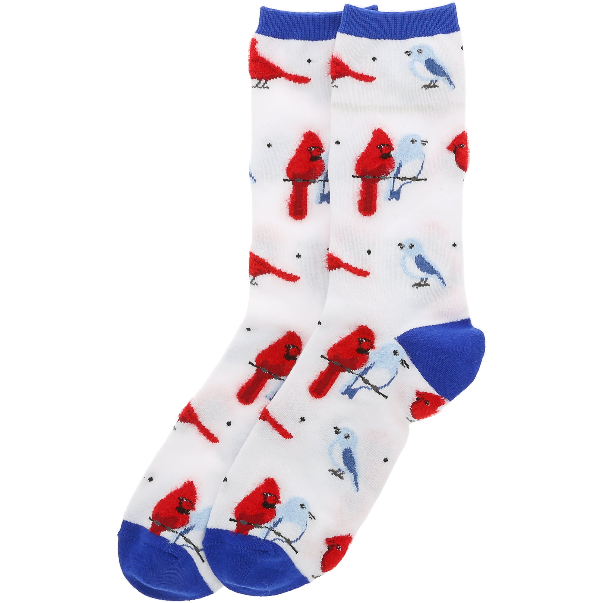 - IN-HOUSE DESIGN: Decorated with red cardinals, bluebirds, and other colorful songbirds perched on black wires, these socks use a bright white background to showcase vivid colors. Blue heel and toe accents provide a complementary touch that highlights the playful bird-themed palette.