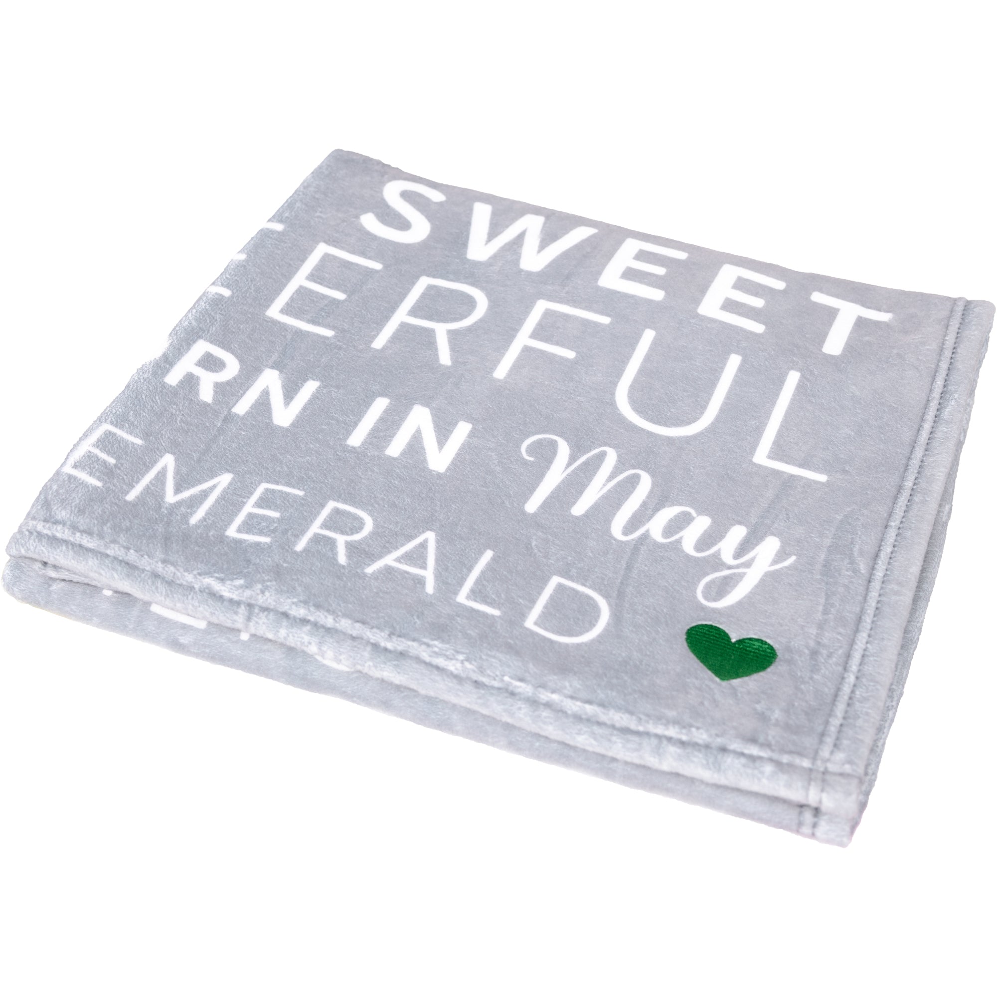 - IN-HOUSE DESIGN: The printed sentiment read "May" down the left side of the blanket along with an "Motivated, Creative, Strong-Willed, Understanding, So Beautiful, Inside And Out, Full Of Life, Joyful, Dedicated, Independent, Hard-Working And Ready To Help, Loving, Protective, Graceful, Diligent, Presistent And Dependable, Enduring, Resolute, Strong, Empthetic, Inspiring, Never Afraid Of A Challenge, Calming & Sweet, Kind, Cheerful, The Best Are Born In May. You’re A Gem: Emerald" which consists of a san serif and cursive font combo. The green heart in the bottom corner of the blanket is embroidered. The reverse side is white only.