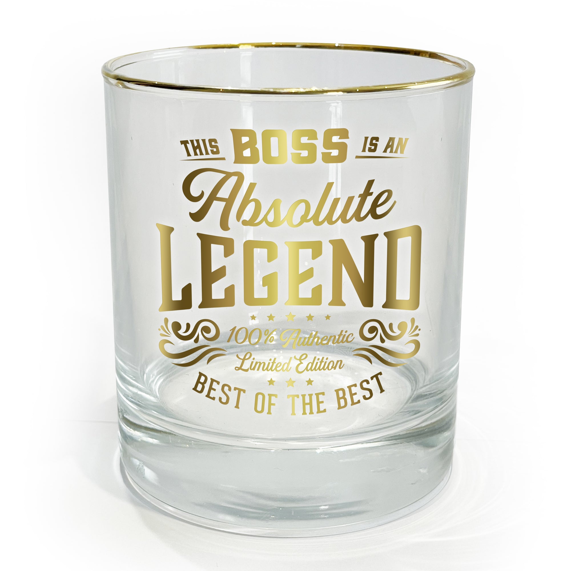 - IN-HOUSE DESIGN: The gold electroplated rim is accompanied by the gold "This Boss Is An Absolute Legend 100% Authentic Limited Edition Best Of The Best" sentiment decal on the front side of the whiskey along with banners and stars. Glassware with a refined, aesthetically pleasing look.