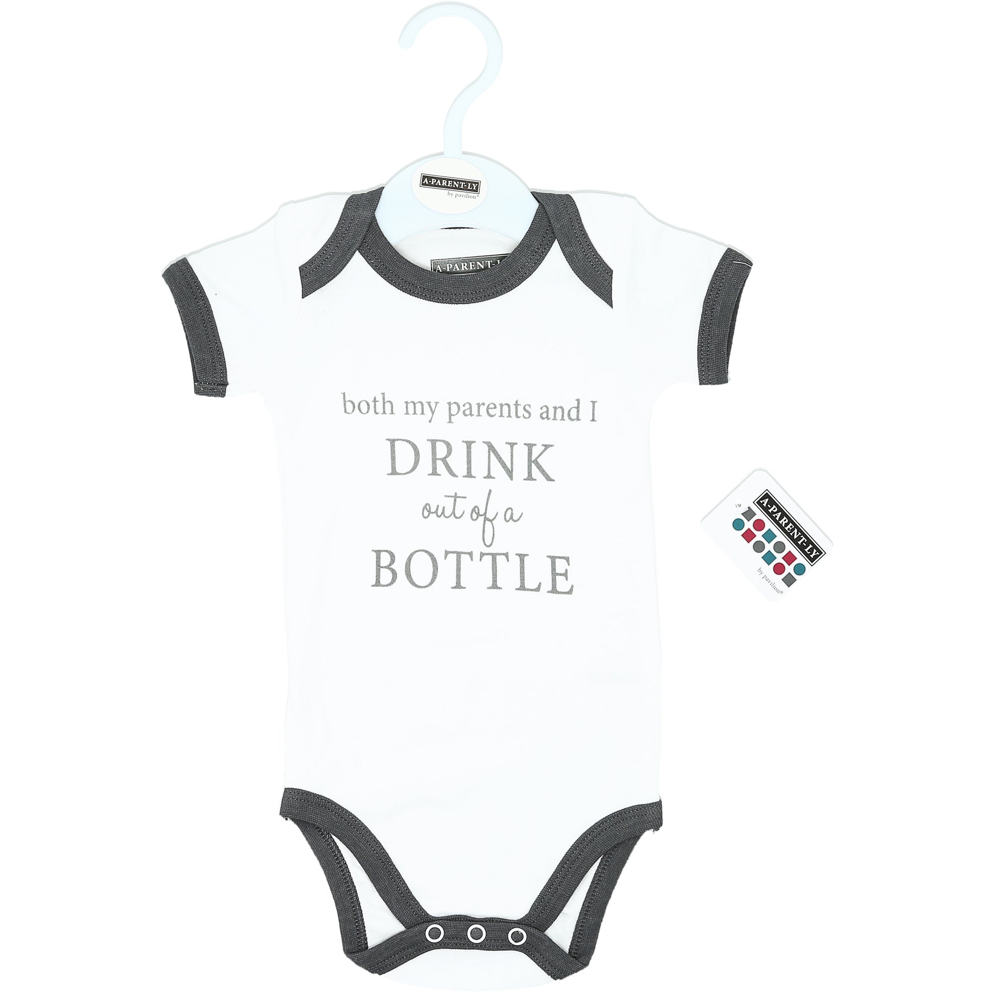 - IN-HOUSE DESIGN: Gray trimmed edges surround the neck, arms, and thighs. The "Both My Parents And I Drink Out Of A Bottle" screen-printed sentiment is on the front center of the bodysuit. Itch-free tagless sizing is printed on the interior collar. The center upper back features a light gray logo.