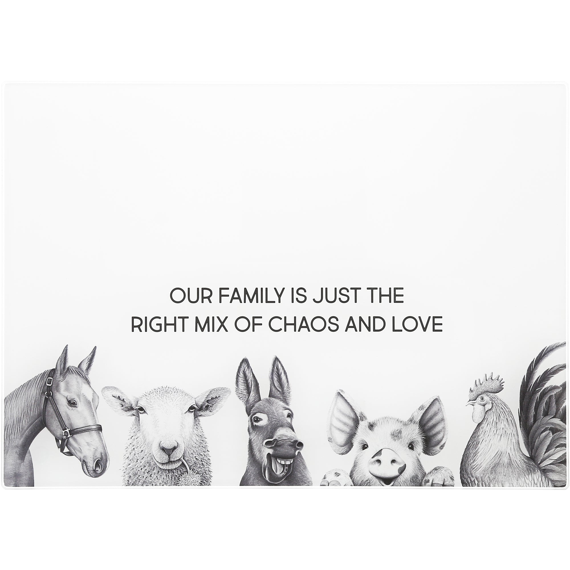 - IN-HOUSE DESIGN: Featuring a family of adorable animals and the sentiment "Our family is just the right mix of chaos and love," this cutting board adds a heartwarming touch to your kitchen. The design is printed with high-quality ink, ensuring it remains vibrant and clear for years to come.