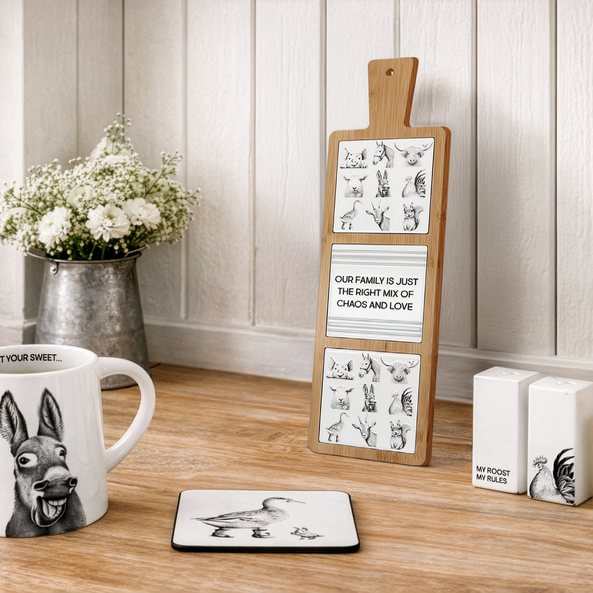 - PREMIUM QUALITY: This 16.5" bamboo and ceramic trivet blends warmth, artistry, and humor into one beautiful piece. The glossy ceramic tile features 3D-printed artwork of adorable animals surrounding the playful sentiment, “Our family is just the right mix of chaos and love.” The bamboo frame offers a natural finish with a handle and hanging hole, perfect for displaying in kitchens or entryways. Designed for decorative use only, each trivet comes safely packaged in a white die-cut box.