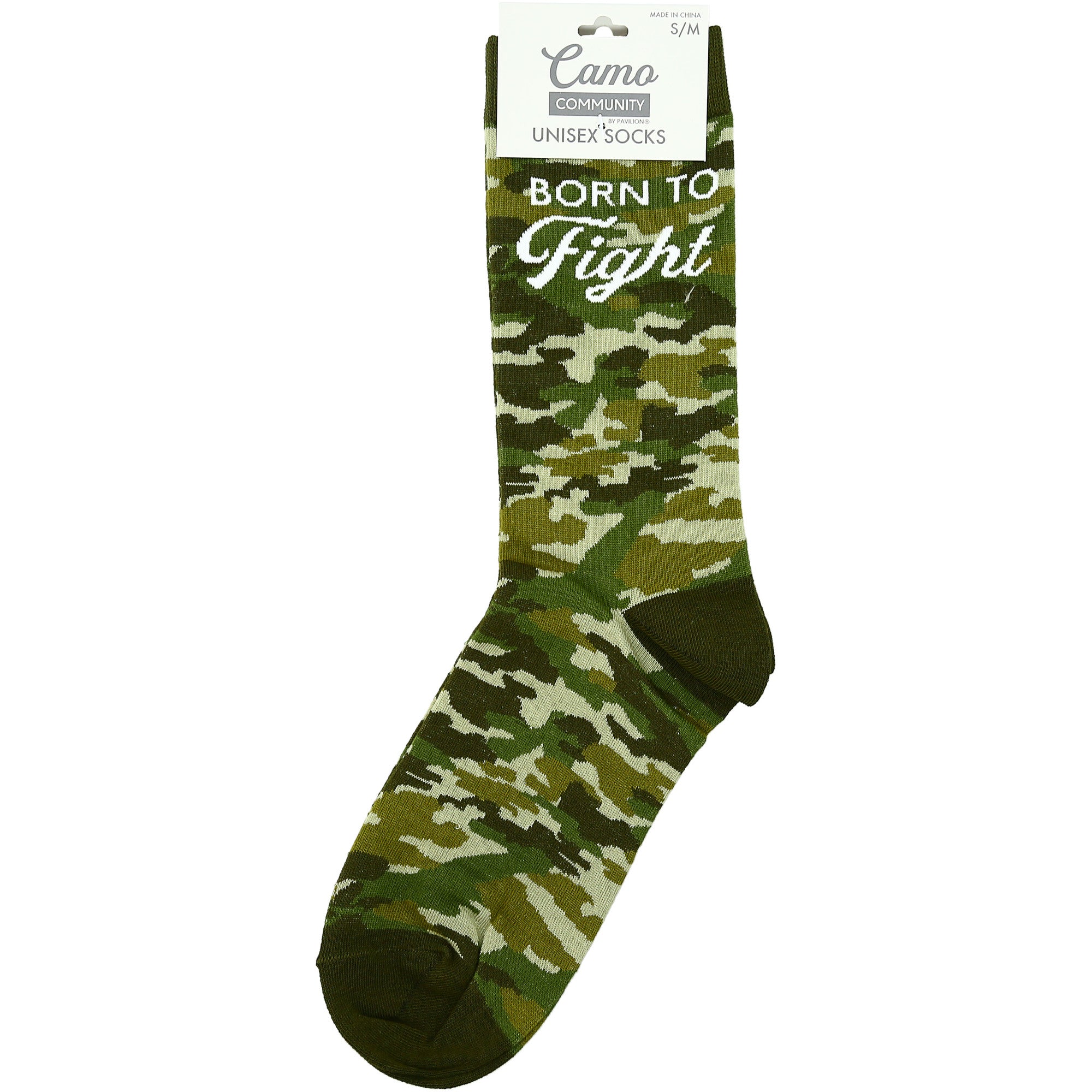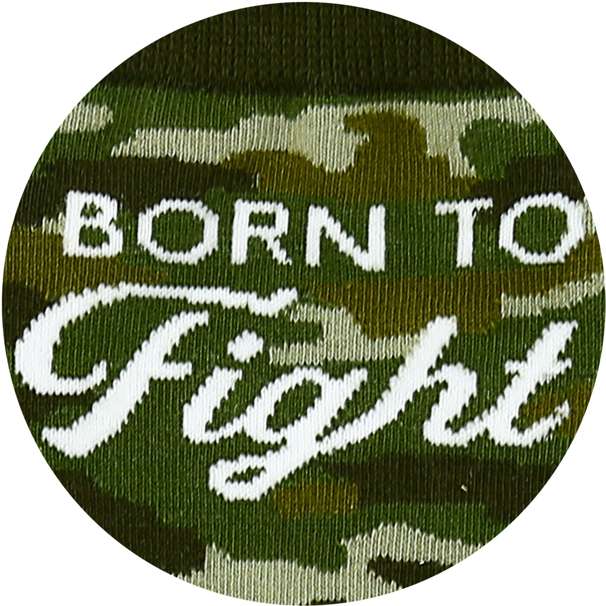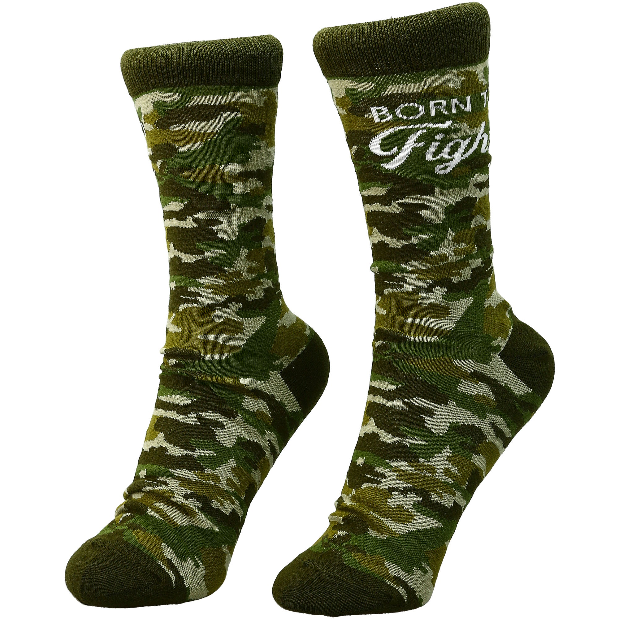 - IN-HOUSE DESIGN: "Born To Fight" text is sewn into the side of the socks with a green camo pattern that covers all but the heel, ankle and toe which are solid.