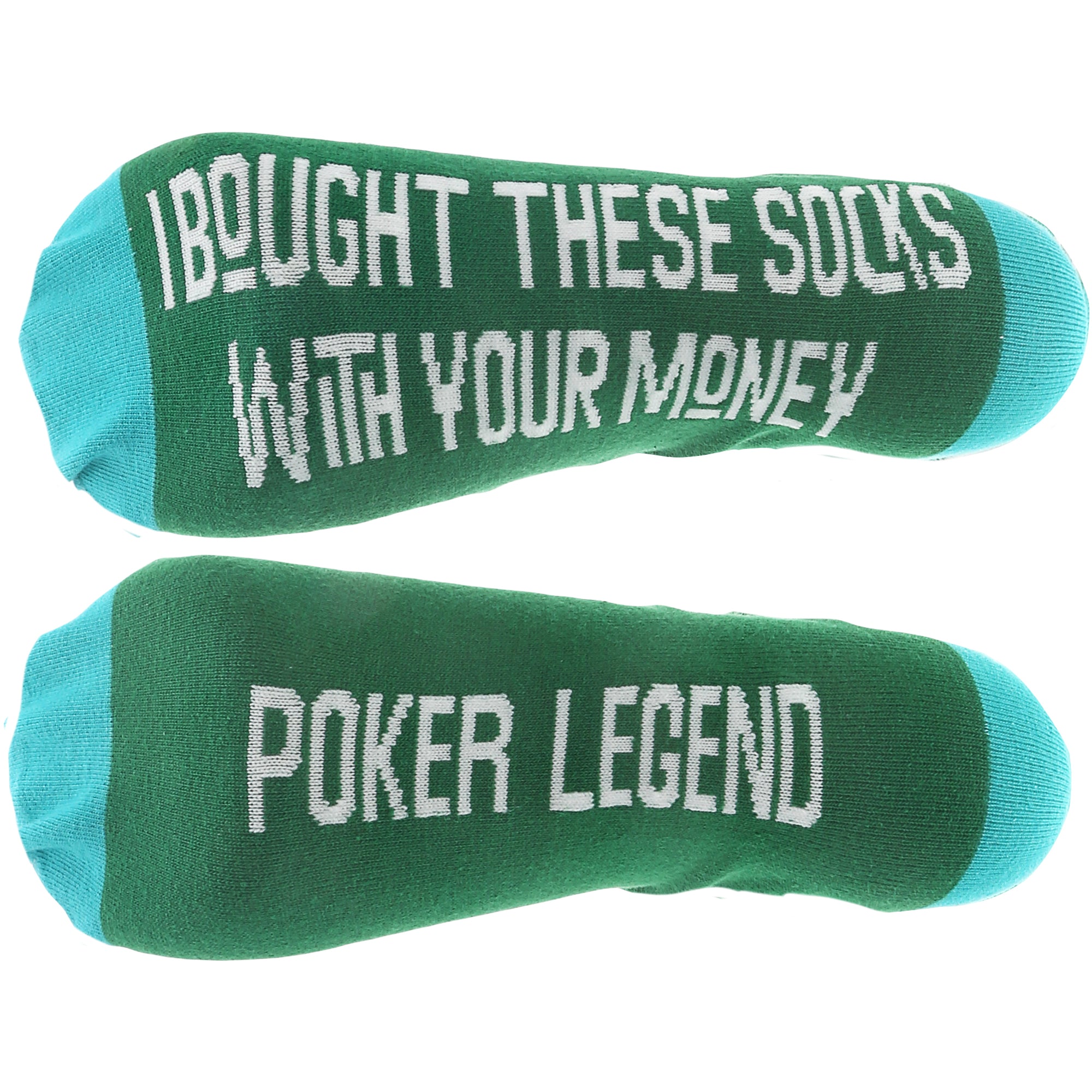 • IN-HOUSE DESIGN: The ankle, heel & toe are teal, whereas the center portion is green with happy and celebratory dancing black, white, green, and red poker chips and playing cards neatly spread in a repetitive pattern surrounding the ankle and the top portion of the foot. The sole of each sock features a different sentiment, "I Bought These Socks With Your Money" and "Poker Legend" in an all-caps white sans serif font.