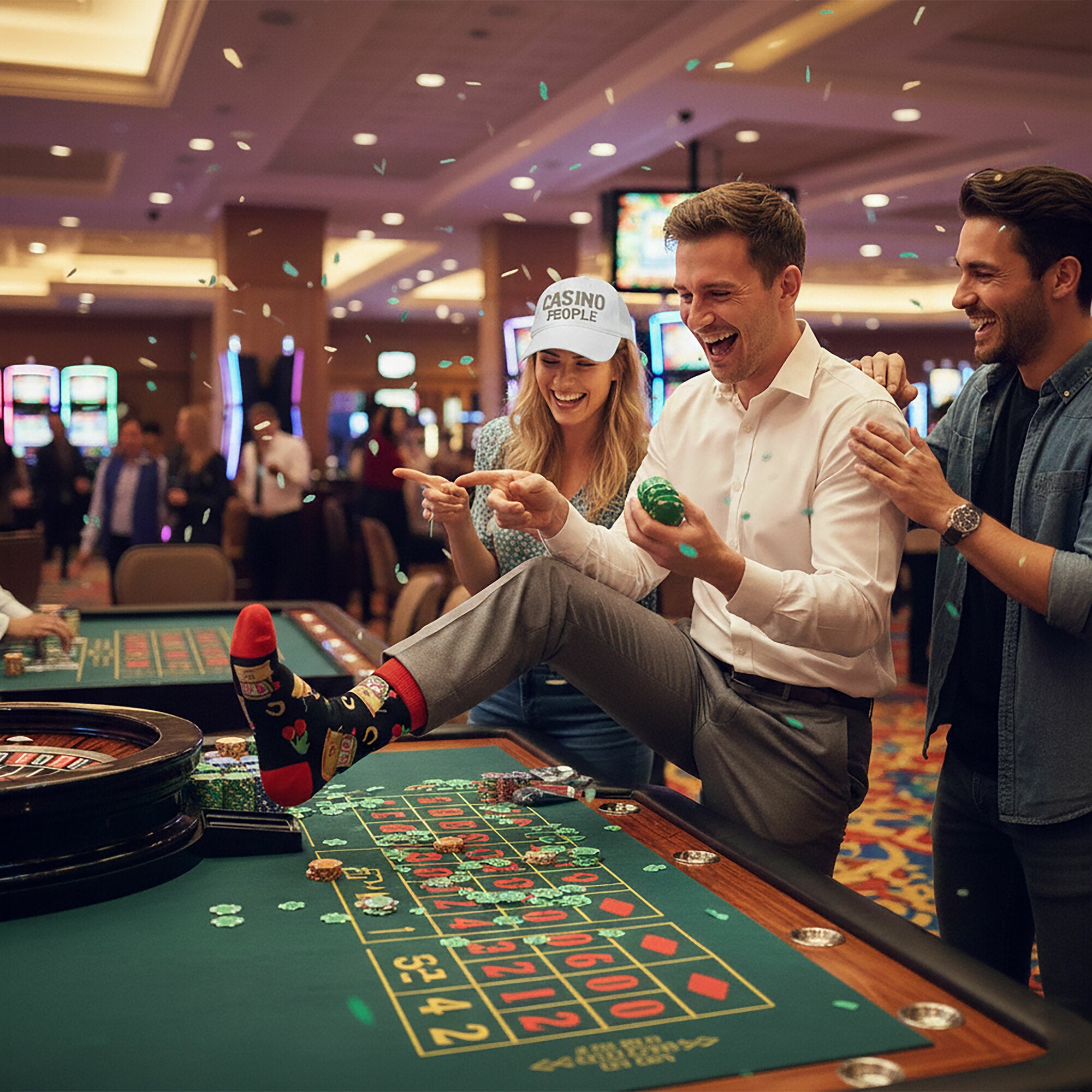 - IN-HOUSE DESIGN: The ankle, heel & toe are red, whereas the center portion is black with happy and celebratory dancing black, white, green, yellow, and red slot machines/horseshoes/four-leaf clovers/cherries neatly spread in repetitive pattern surrounding the ankle and the top portion of the foot. The sole of each sock features a different sentiment, "Jackpot!" and "My Lucky Slot Machine Socks" in an all-caps white sans serif font.