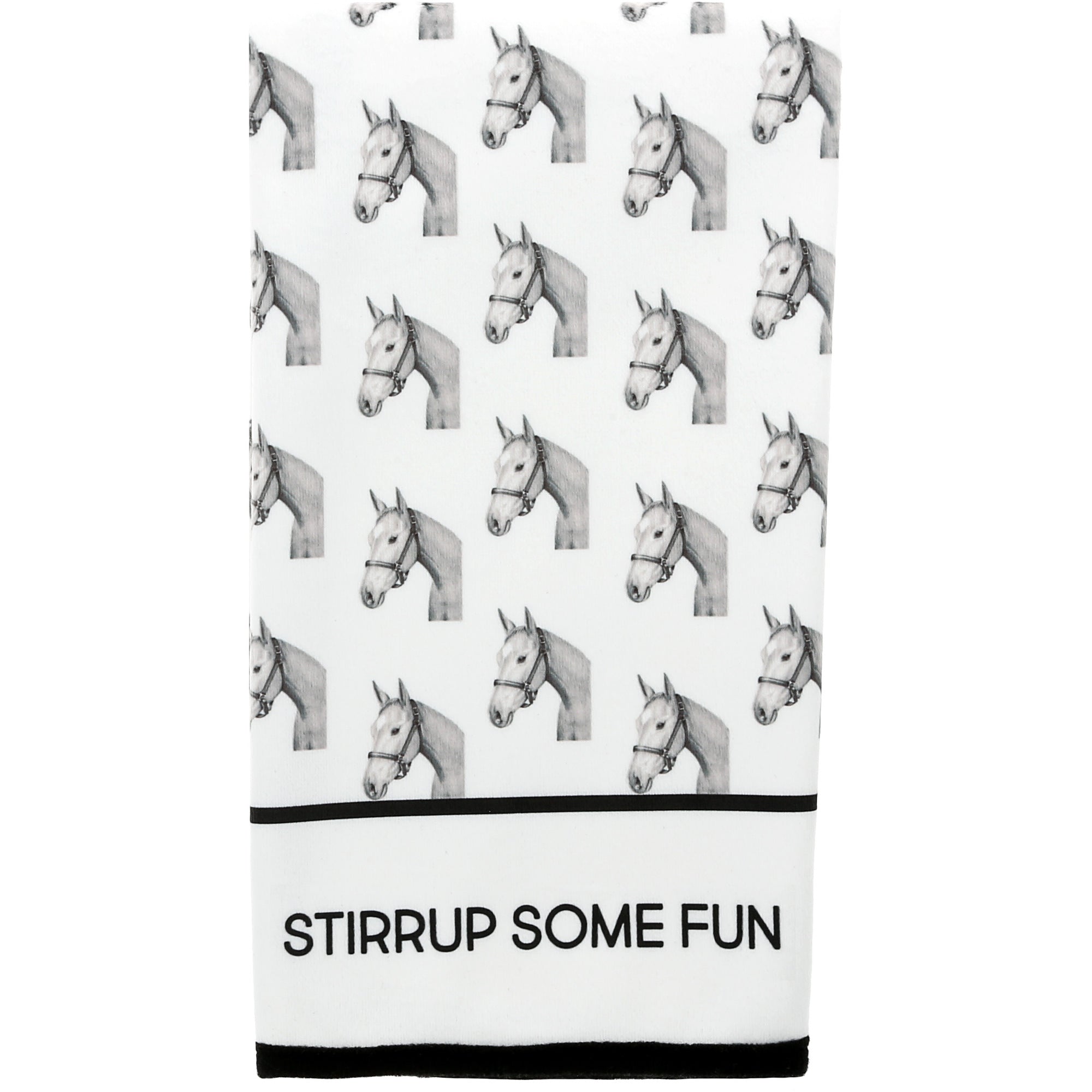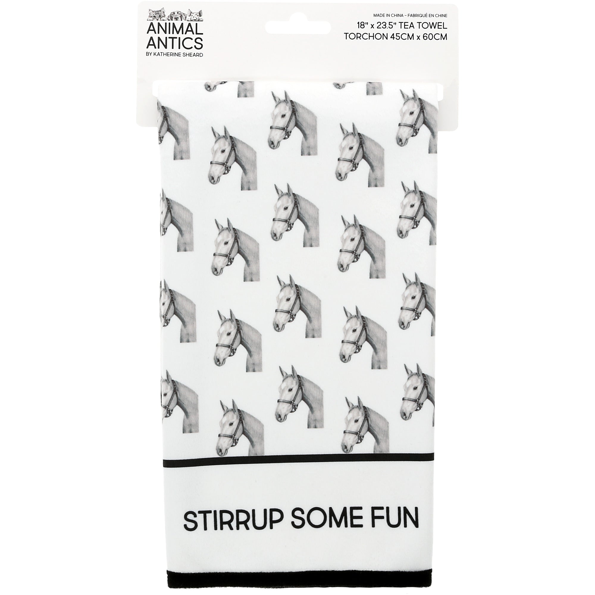 - IN-HOUSE DESIGN: Features a repeating pattern of illustrated horses, paired with the phrase “Stirrup Some Fun” printed across the front. This quirky and punny design is part of the Animal Antics collection by artist Katherine Sheard, offering a whimsical way to add equestrian charm to your kitchen.