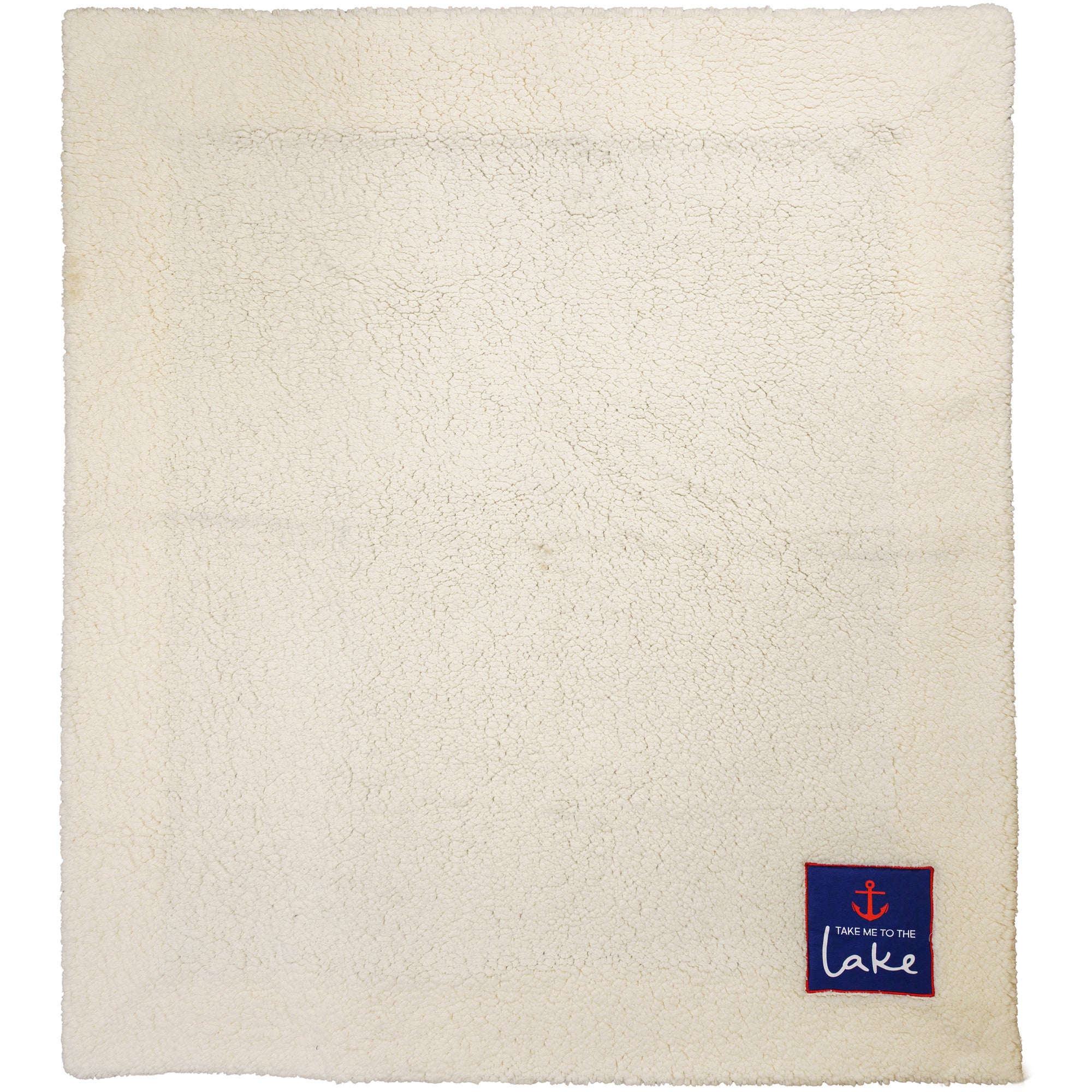 • IN-HOUSE DESIGN: The primary sherpa side features a square in the bottom right stitched in with red edges, a blue background with a "Take Me To The Lake" sentiment that features a red anchor. The mainly printed side has a blue background featuring a white anchor, blue fish, red oar, red/blue fish hook, and "Livin' The Lake Life" white sentiment in a repetitive pattern.