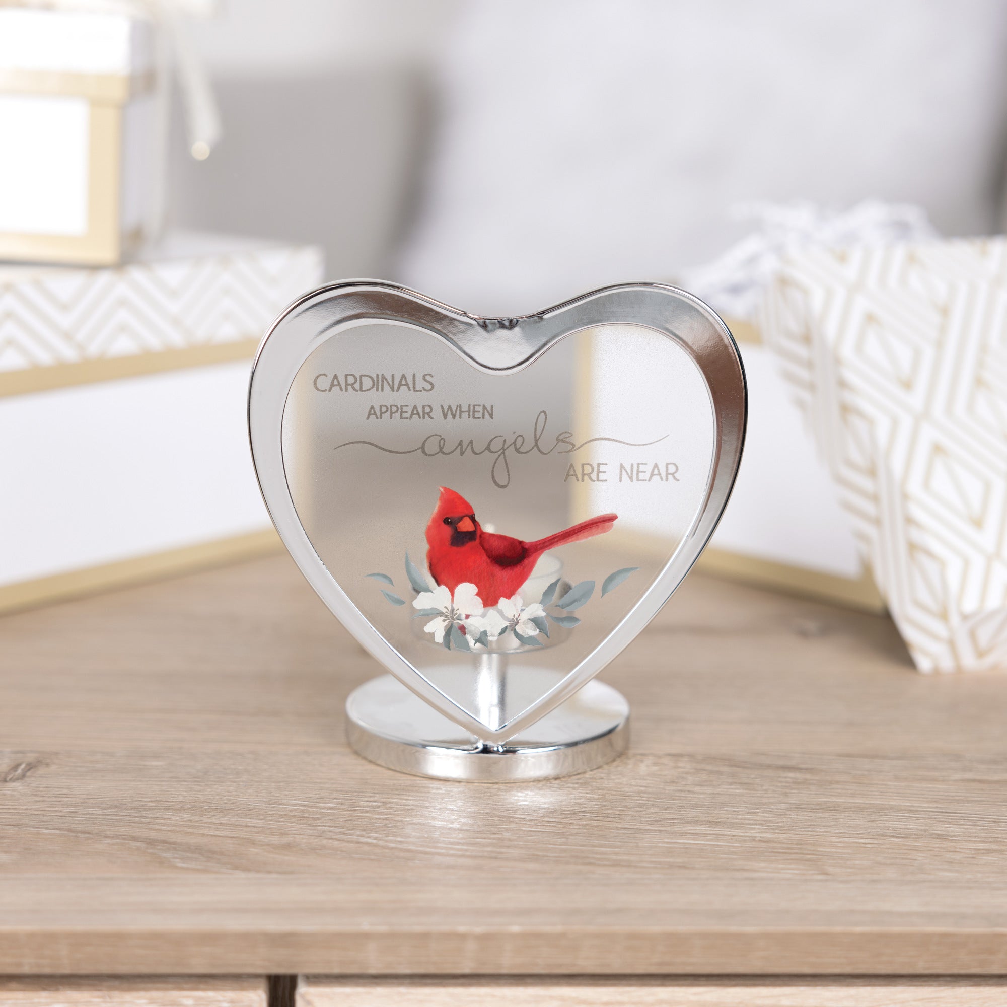 - IN-HOUSE DESIGN: A vibrant red cardinal perches on a delicate cherry blossom branch, accompanied by the sentiment, "Cardinals Appear When Angels Are Near." This heartfelt message is beautifully displayed on the center of the holder.