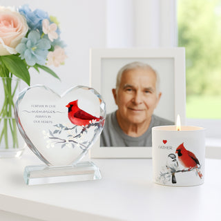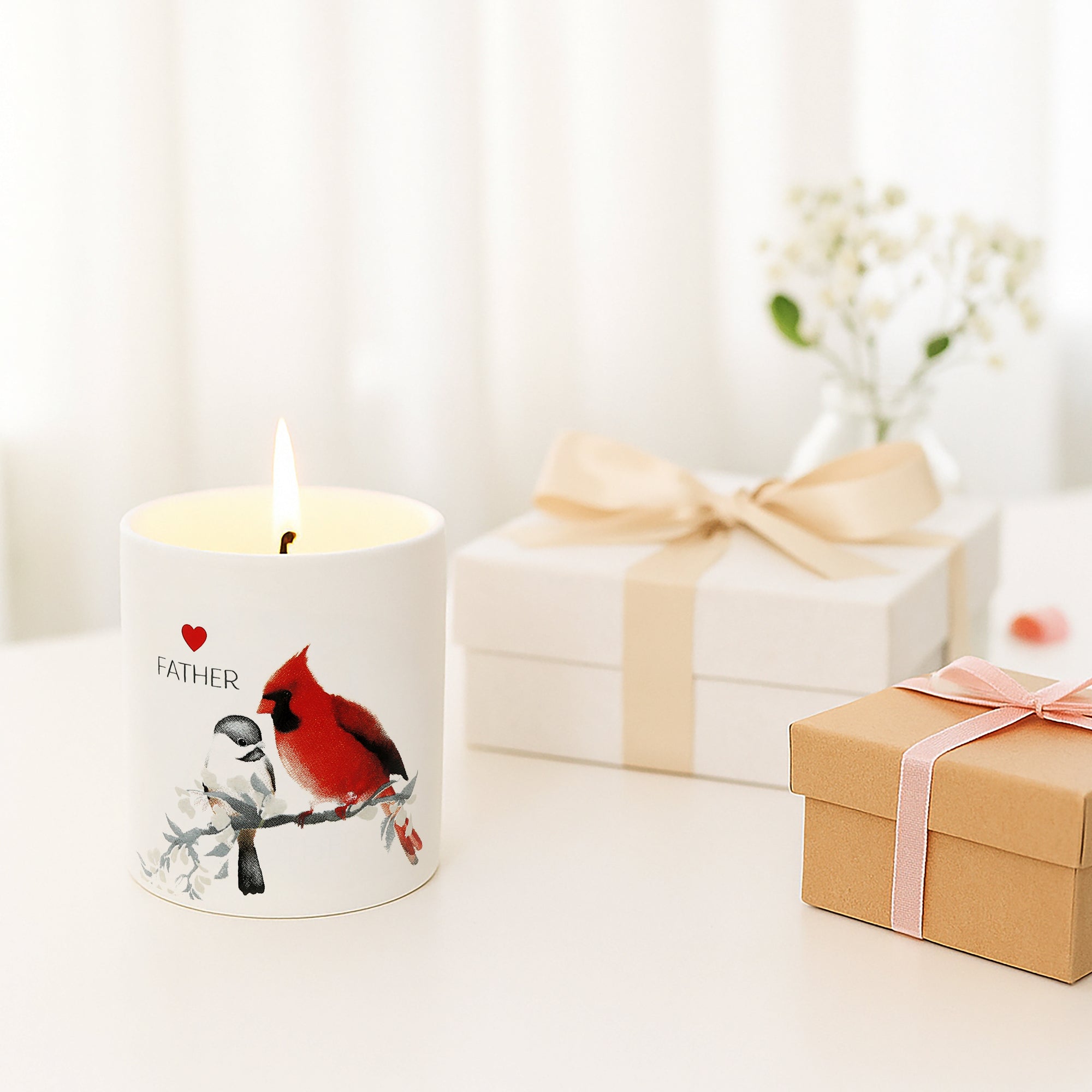 - PREMIUM QUALITY: This 2.5 oz soy wax candle is expertly crafted to emit a gentle tranquility scent while housed in a smooth, glossy white ceramic vessel. Featuring a cardinal and chickadee perched on delicate branches, the design is a powerful representation of guidance, strength, and enduring fatherly love.