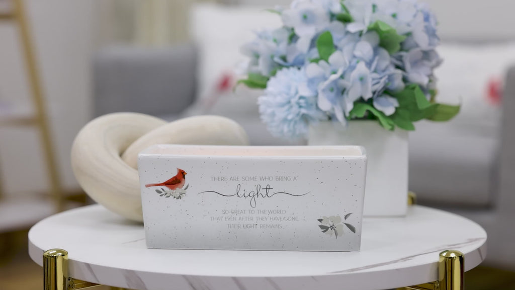 - IN-HOUSE DESIGN: A candle that honors your beloved. You'll witness delicate cherry blossoms & a red cardinal with the sentiment "Always In Our Hearts" begin to show 10 minutes into burning. After an hour, the full decal unveils, only to retreat & resurface with each subsequent burn. The front of this candle is adorned with a quote: "There Are Some Who Bring A Light So Great To The World That Even After They Have Gone Their Light Remains." Ombre white & gray pattern, speckled with gray accents.