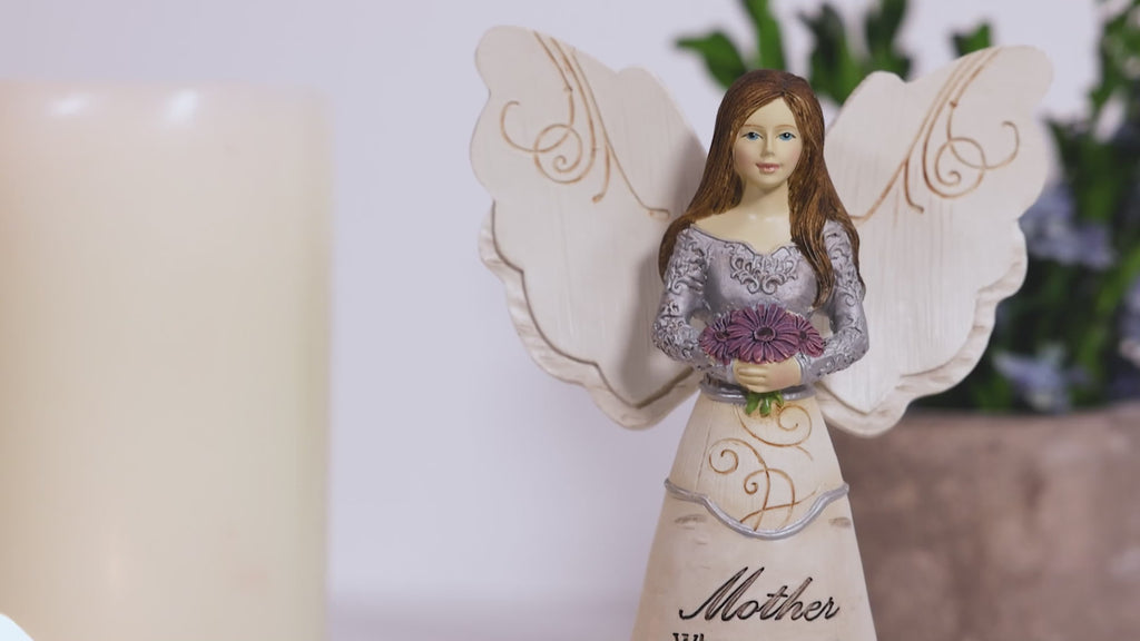 - IN-HOUSE DESIGN: "Mother Wherever You Go, Whatever You Do, May This Guardian Angel Watch Over You" text is debossed and painted onto the front of the angel, alongside an intricate silver design and flowers. The brown haired angel is holding a beautiful bouquet of purple flowers. There are foam pads on the bottom to prevent surfaces from being scratched.
