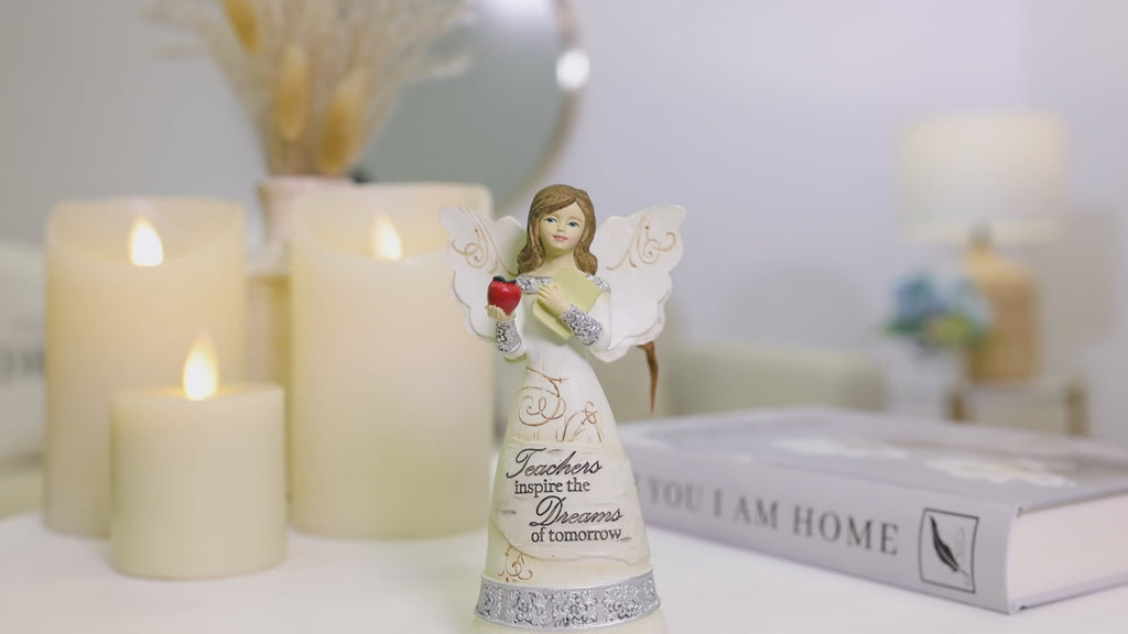 - IN-HOUSE DESIGN: This beautiful brown haired angel is holding a book and an apple with a stunning silver trimmed dress. "Teachers Inspire The Dreams Of Tomorrow" text is debossed and painted onto the front of the angel, alongside an intricate silver design, book, and apple.