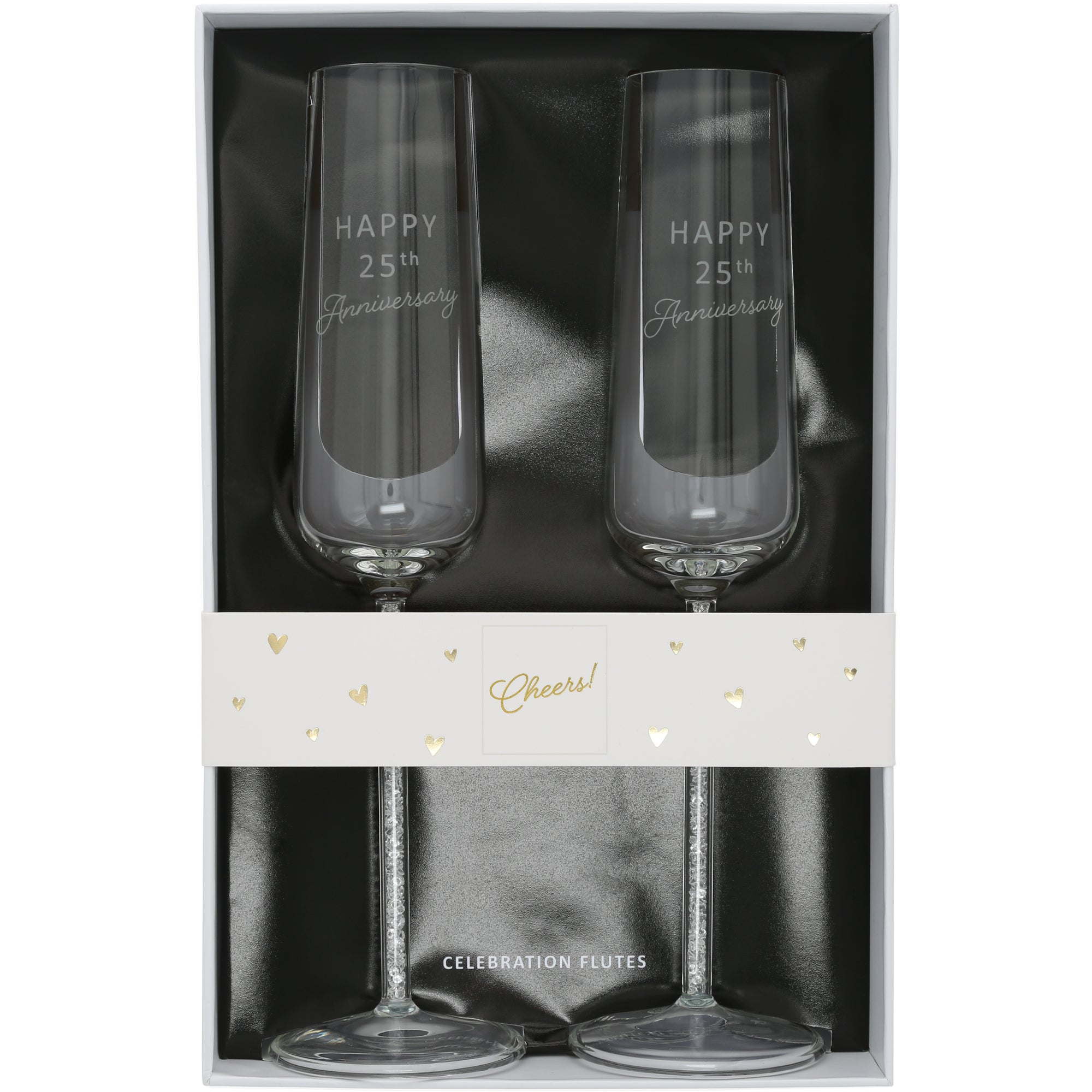 - PREMIUM QUALITY: This wonderful set of champagne flutes is crafted from glass with sparkly clear crystal gems within the stemmed glassware. The black background white gift box has heat-stamped hearts on the "Happy 25th Anniversary" lid and a wrapped belly band with a "Cheers!" sentiment.