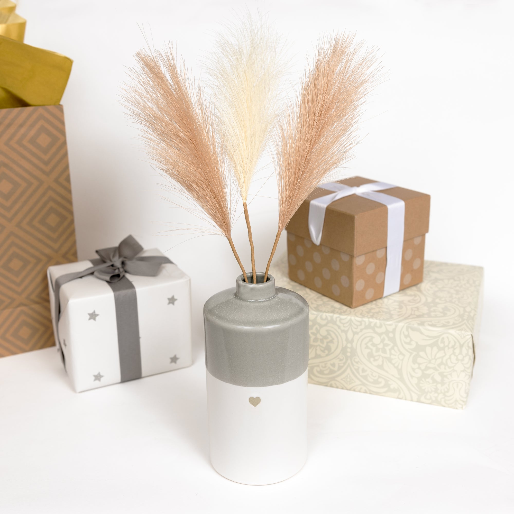 - IN-HOUSE DESIGN: The matte gray heart icon is stamped and debossed onto the middle front of the vase. The grass pieces are green; one is cream, and the others are nude/beige-colored.