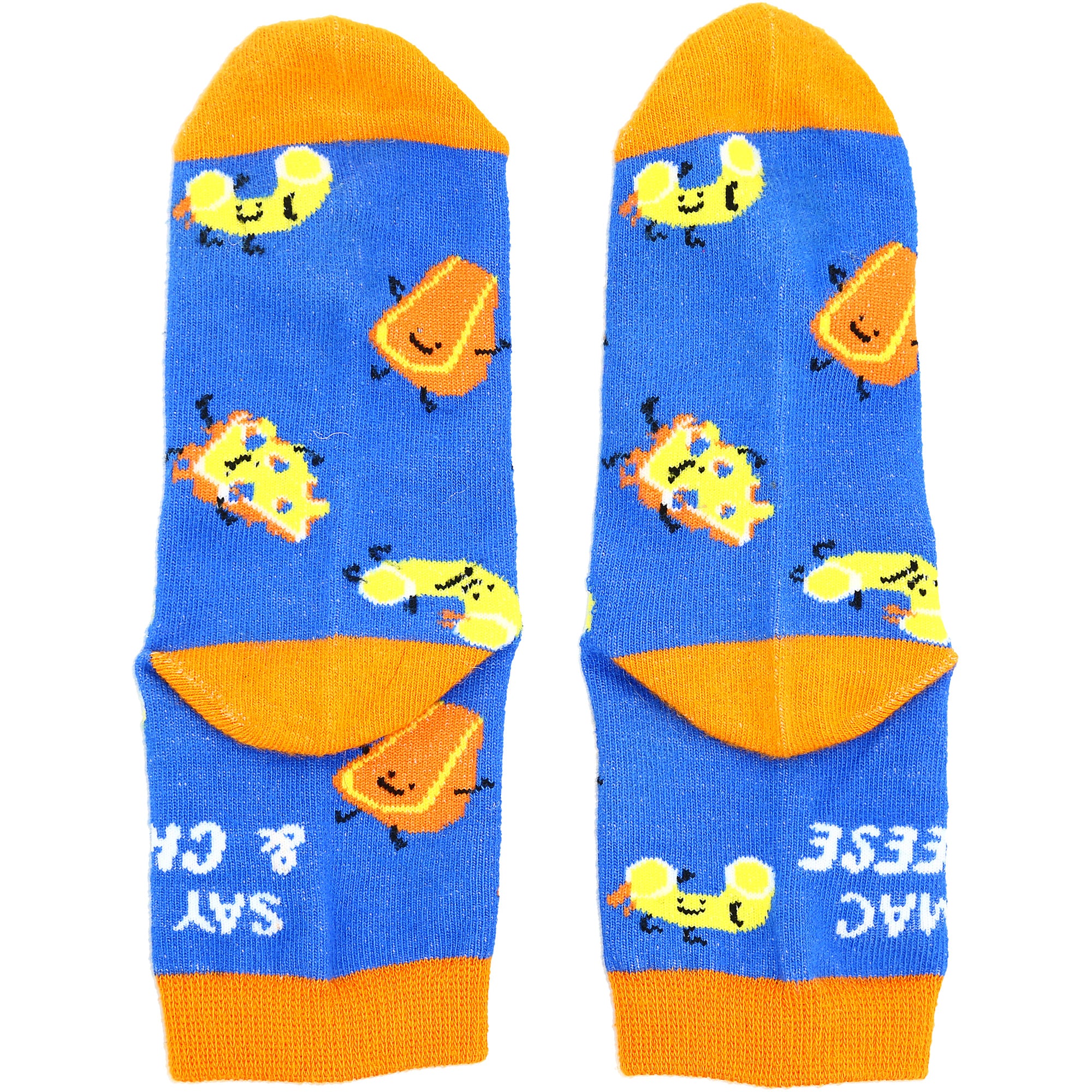• IN-HOUSE DESIGN: Features a sewn-in mac and cheese pattern on the blue top and side parts of the sock. The outer ankles feature “Say Mac & Cheese” text that is also sewn in. The toes, heels and tops are a solid orange color. Socks come packaged inside of a plastic poly bag with a hangtag and ribbon.