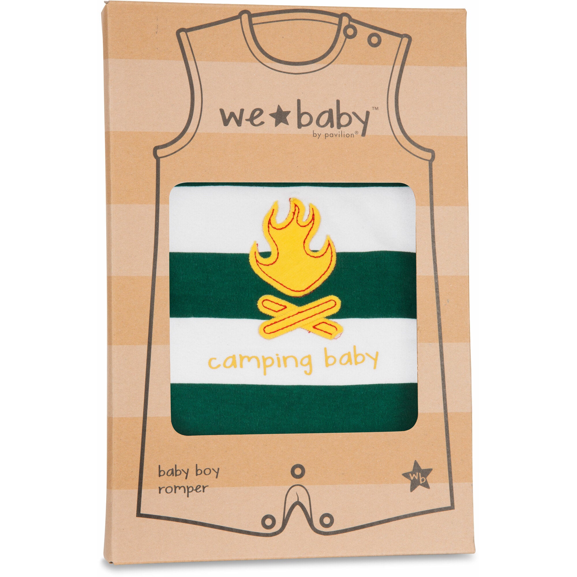 - IN-HOUSE DESIGN: "Camping Baby" text is screen printed, as is the We Baby logo on the bottom of the romper.