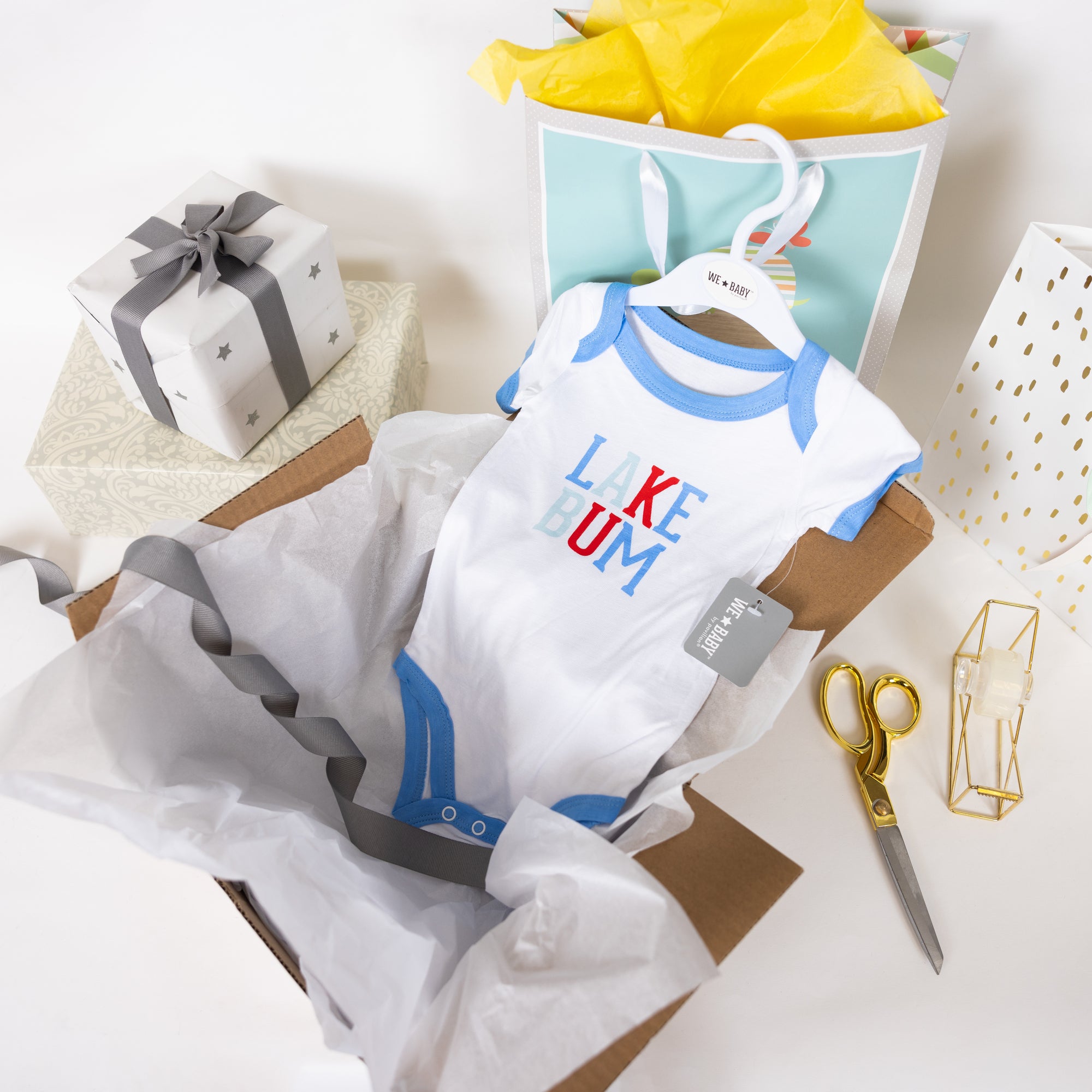 - IN-HOUSE DESIGN: Blue trimmed edges surround the neck, arms, and thighs. The light blue, dark blue, and red "Lake Bum" screen-printed sentiment is on the front center of the bodysuit. Itch-free tagless sizing is printed on the interior collar. The center upper back features a light gray logo.