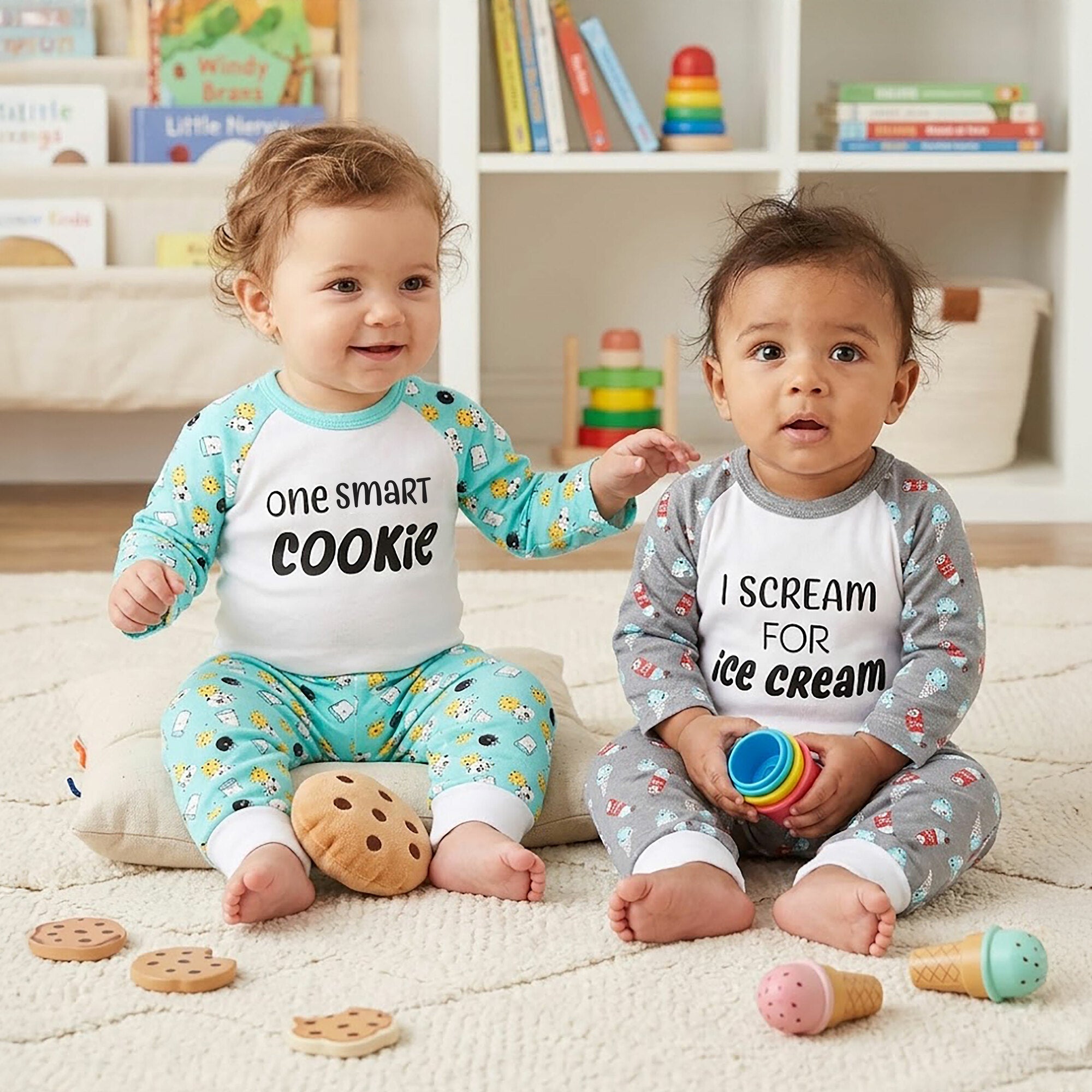 - IN-HOUSE DESIGN: "One Smart Cookie" text is printed onto the front of the bodysuit, while the sleeves and pants feature a pattern of cookies and milk.