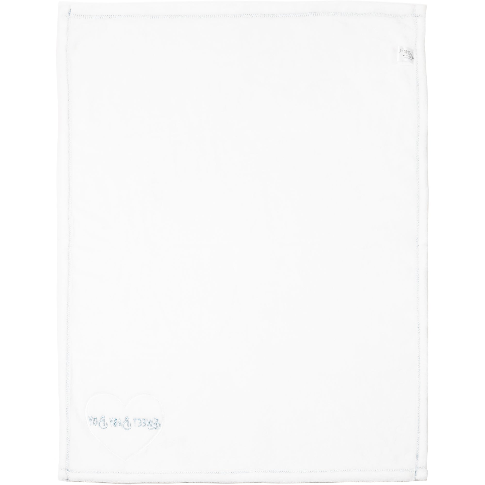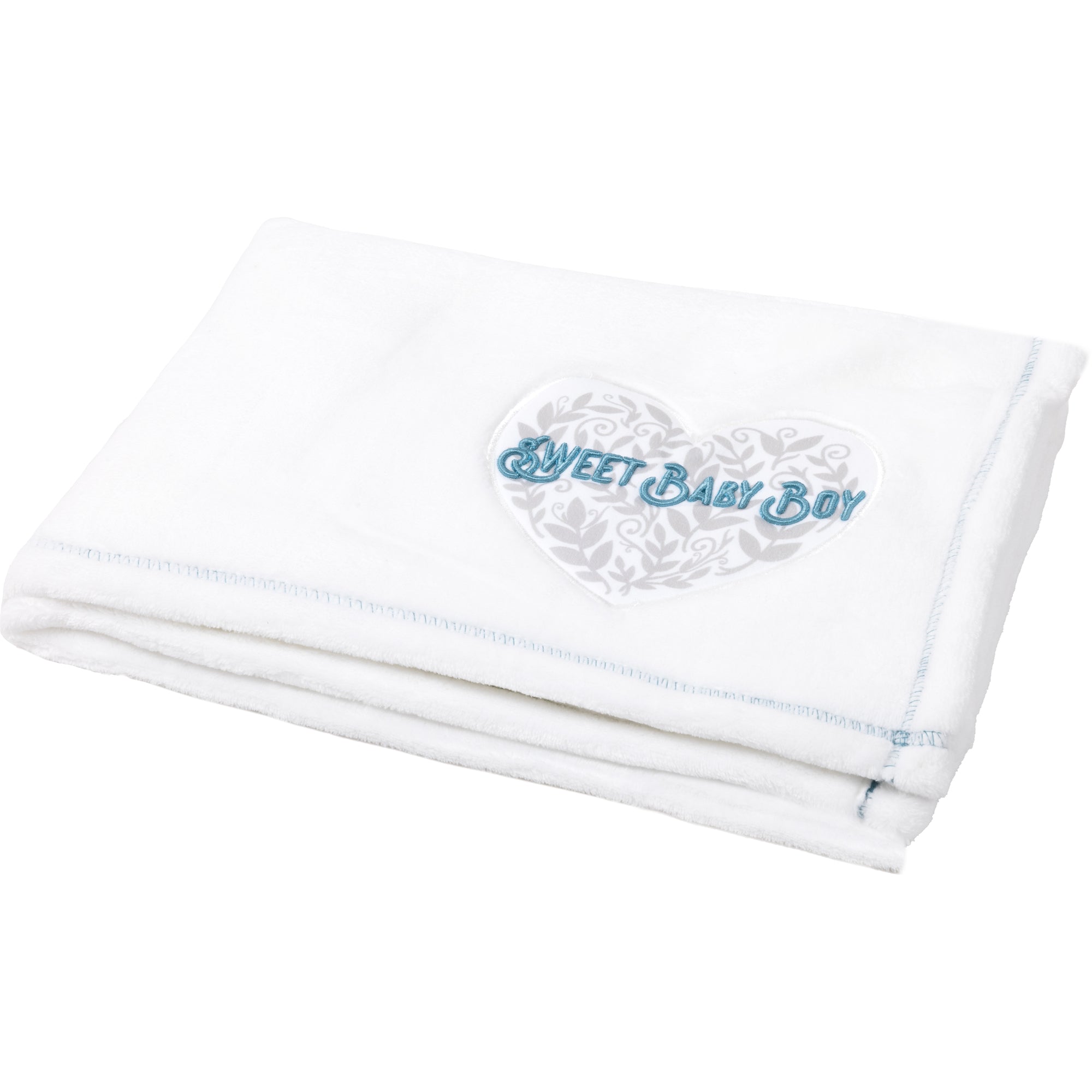 - IN-HOUSE DESIGN: A blue "Sweet Baby Boy" embroidered sentiment that is uplifting and comforting is featured on the bottom right corner of the front of the white home décor blanket with blue stitched edges on a white heart with a gray vine printed design embroidered edge patch.