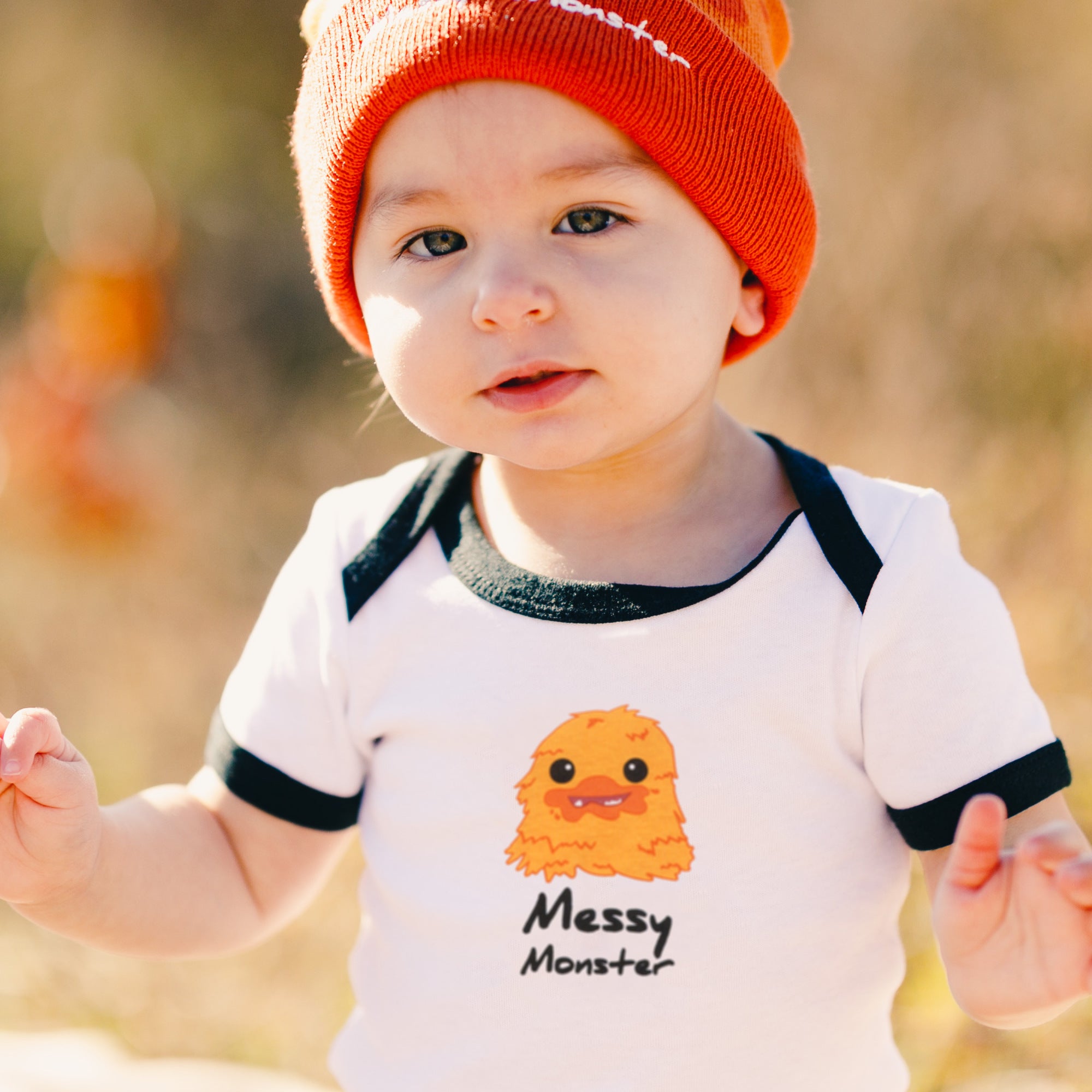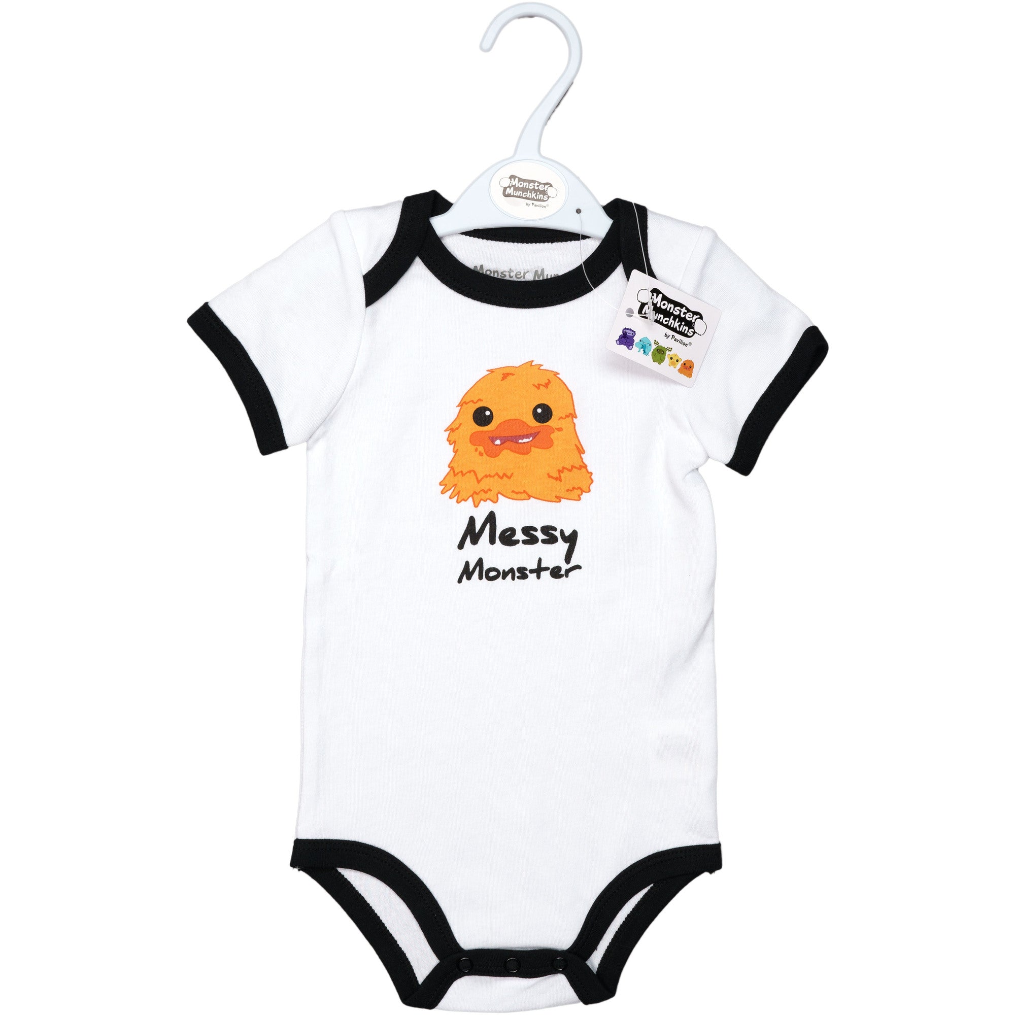 - IN-HOUSE DESIGN: Black trimmed edges go around the neck, arms, and thighs. The large fuzzy messy-haired, dirty-faced monster is accompanied by "Messy Monster" screen-printed sentiment on the front center of the bodysuit. Itch-free tagless sizing is printed on the interior collar.