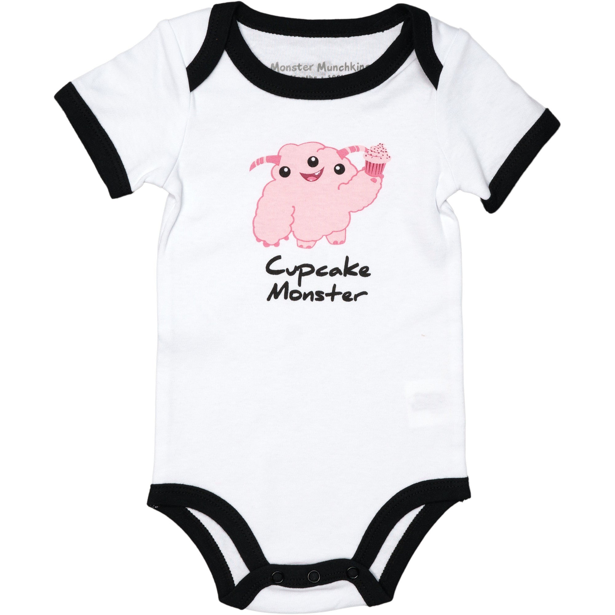 - IN-HOUSE DESIGN: Black trimmed edges go around the neck, arms, and thighs. The puffy double-horned, three-eyed, cupcake-holding monster is accompanied by "Cupcake Monster" screen-printed sentiment on the front center of the bodysuit. Itch-free tagless sizing is printed on the interior collar.