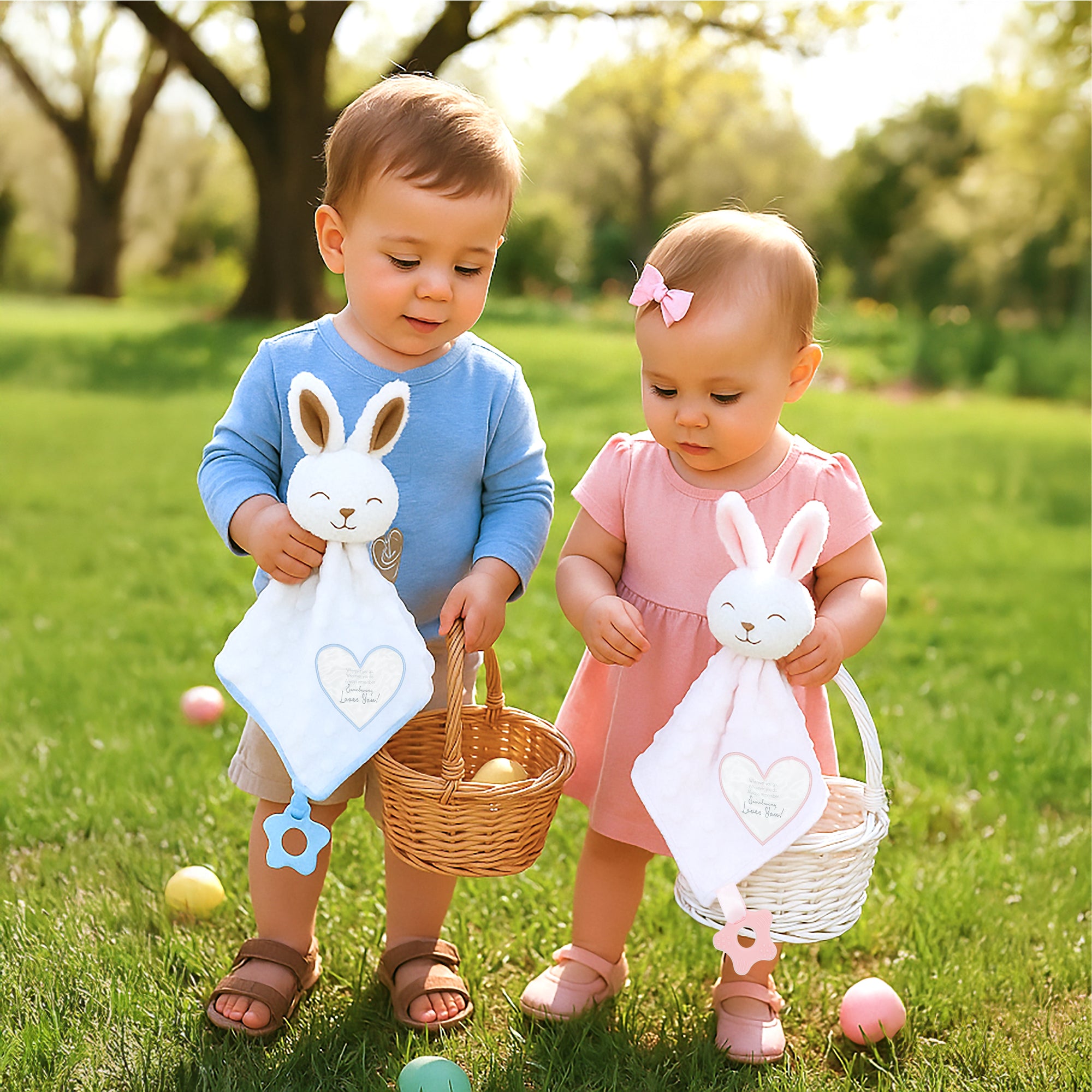 - IN-HOUSE DESIGN: The top of the blanket has a risen white polka dot texture, and the ears' pink backside and interior are cozy. The blue teether has raised dots to relieve the gums. The pink embroidered heart patch has a "Wherever You Go, Whatever You Do, Always Remember Somebunny Loves You!" sentiment printed onto it. The bunny's smiling face is embroidered.