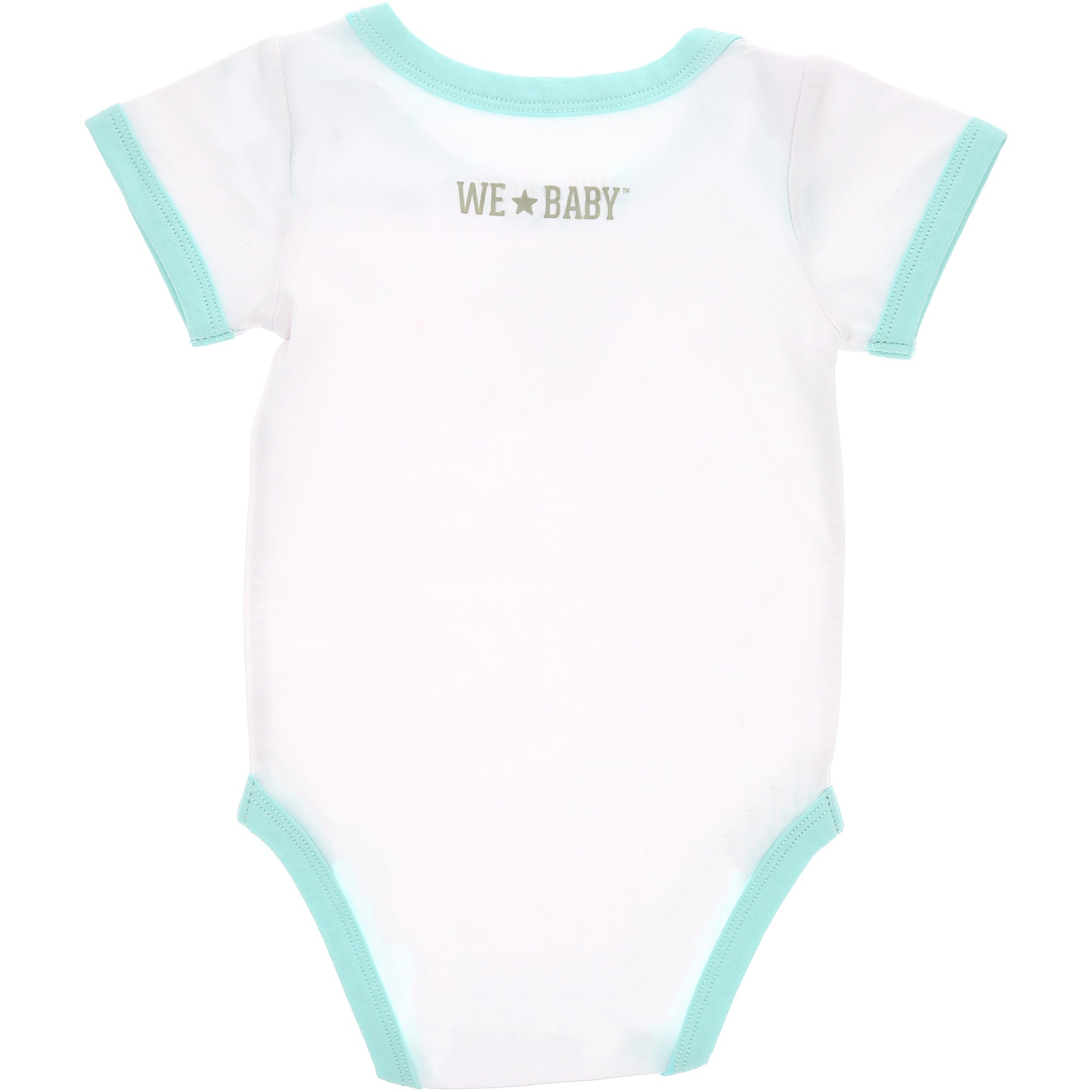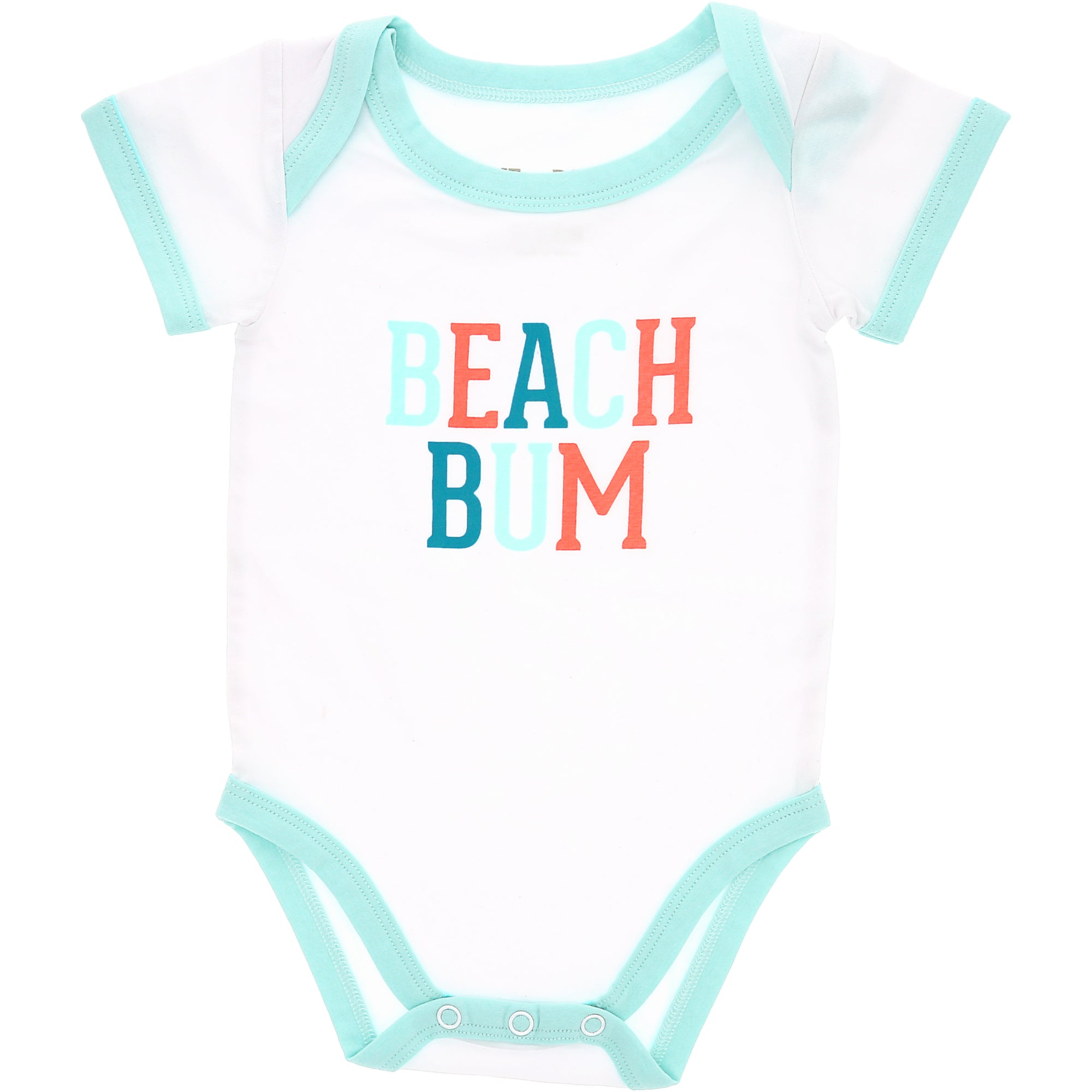 - IN-HOUSE DESIGN: Aqua blue trimmed edges surround the neck, arms, and thighs. The light aqua blue, dark teal blue, and coral "Beach Bum" screen-printed sentiment is on the front center of the bodysuit. Itch-free tagless sizing is printed on the interior collar. The center upper back features a light gray logo.