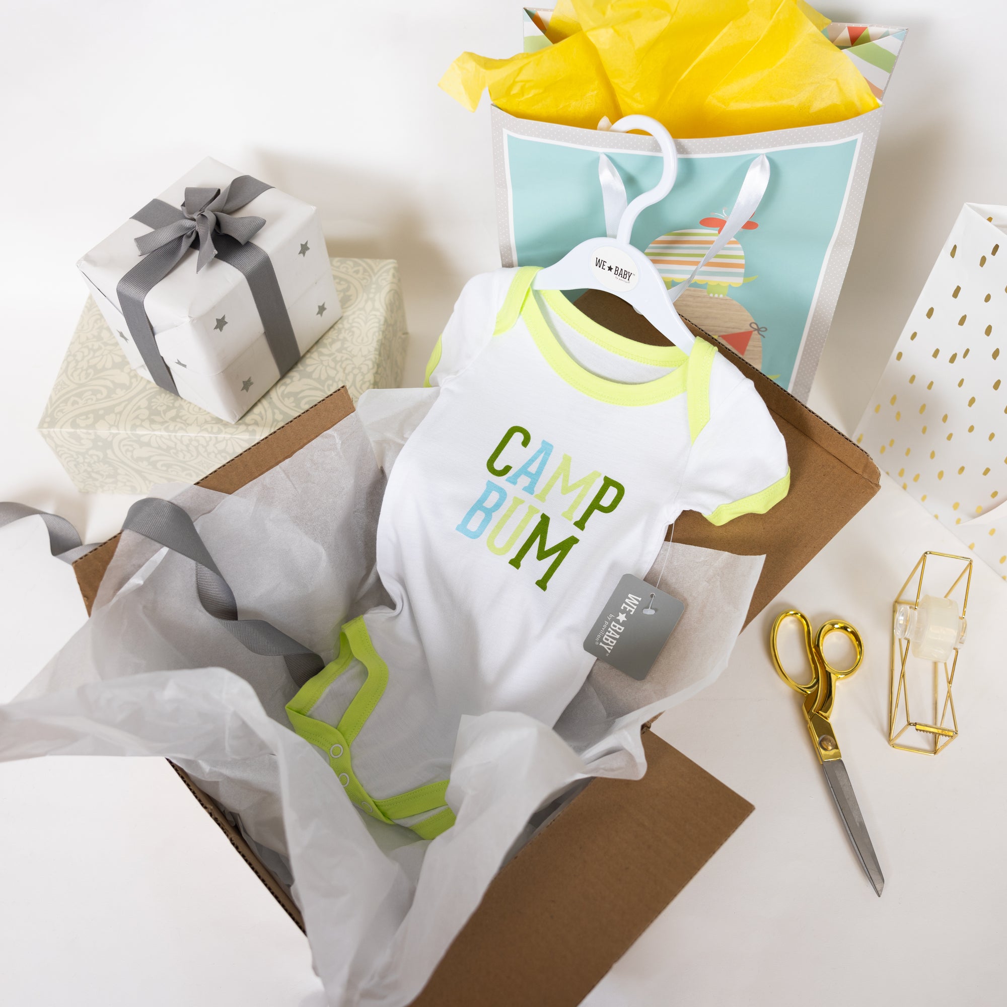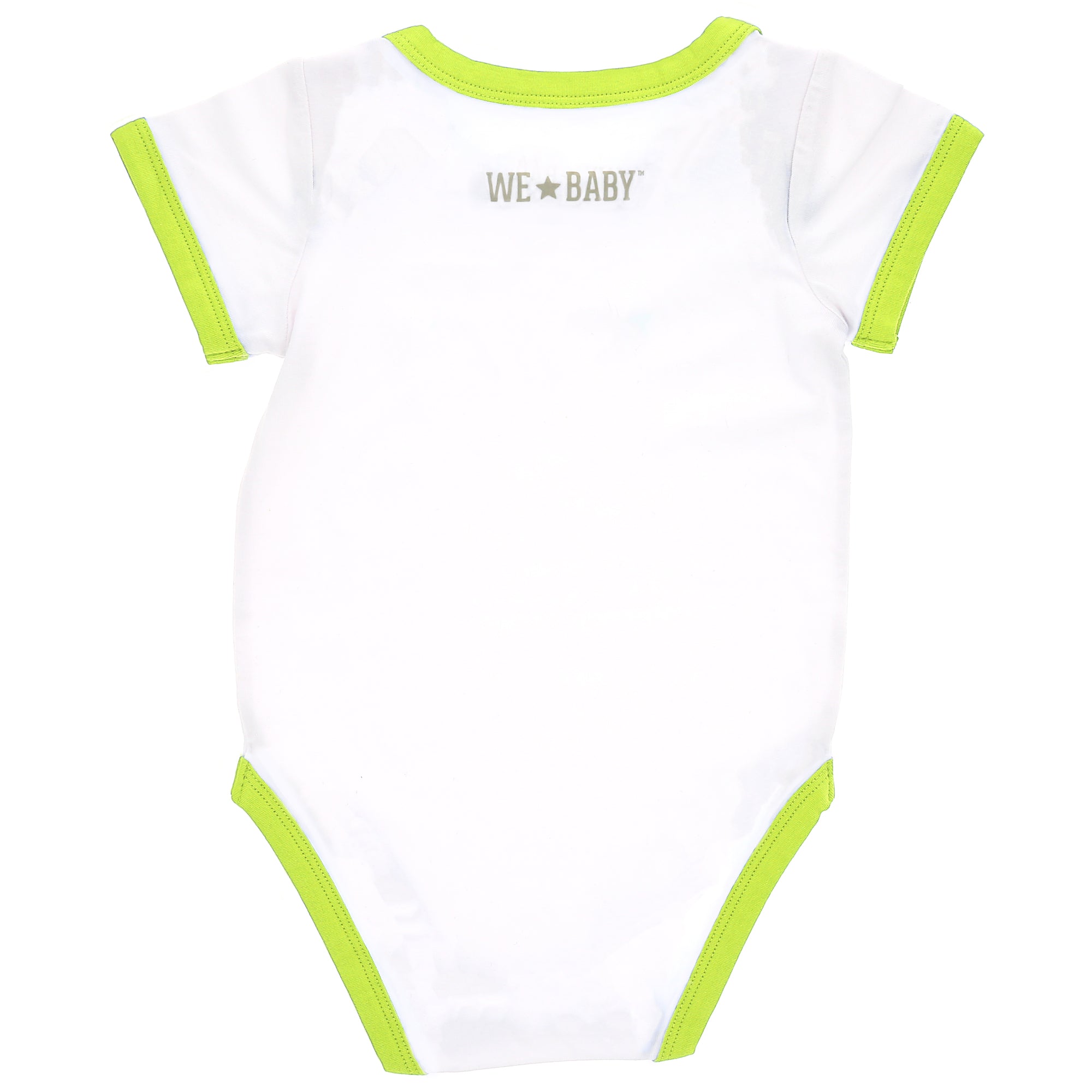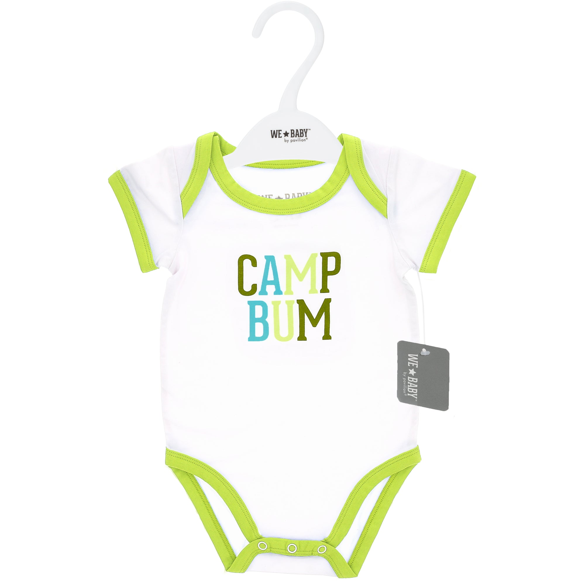 - IN-HOUSE DESIGN: Bright green trimmed edges surround the neck, arms, and thighs. The bright green, olive green, and teal blue "Camp Bum" screen-printed sentiment is on the front center of the bodysuit. Itch-free tagless sizing is printed on the interior collar. The center upper back features a light gray logo.