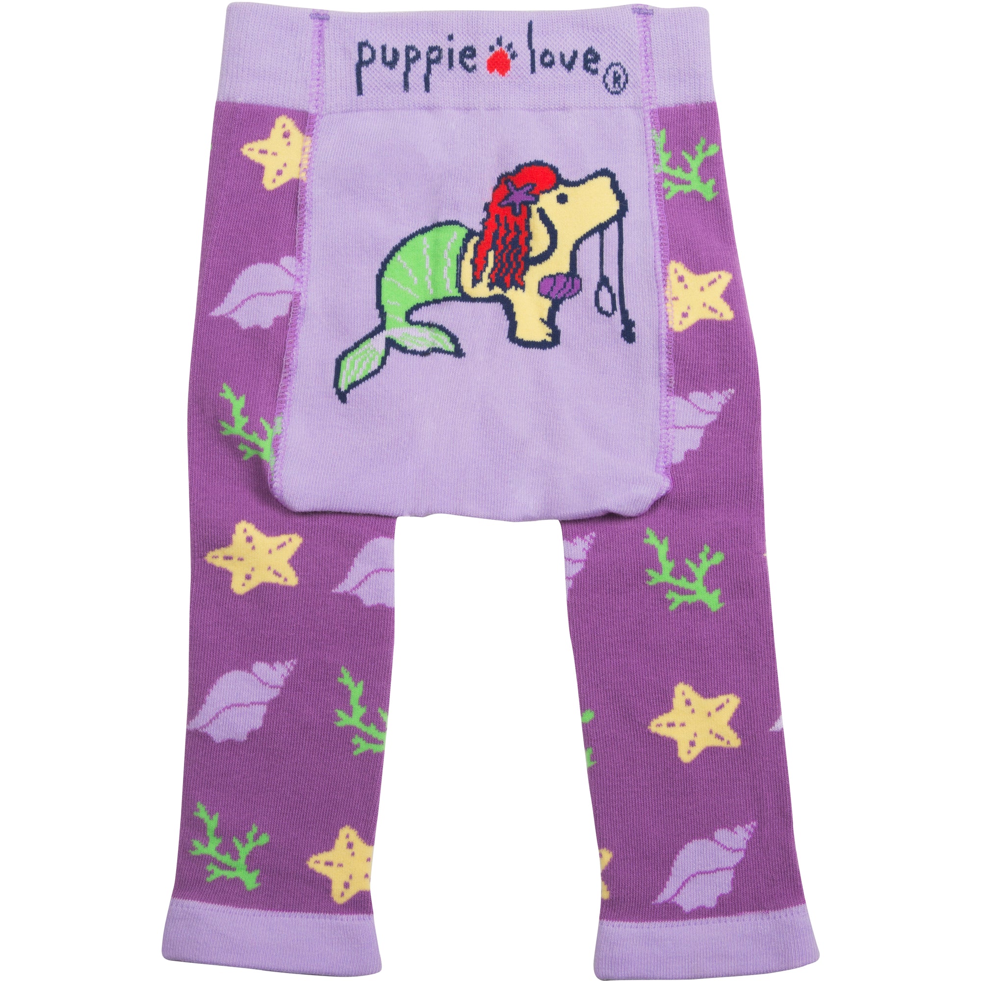 • IN-HOUSE DESIGN: "Puppie Love" text is sewn into the waistband, mermaid-themed dog image is sewn into the rear, and the shell and seaweed pattern of the main material covers the rest of the leggings.